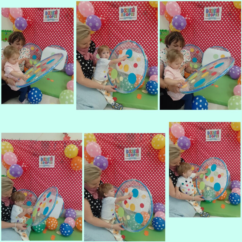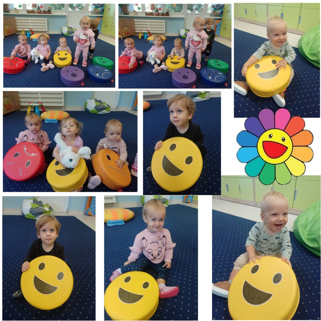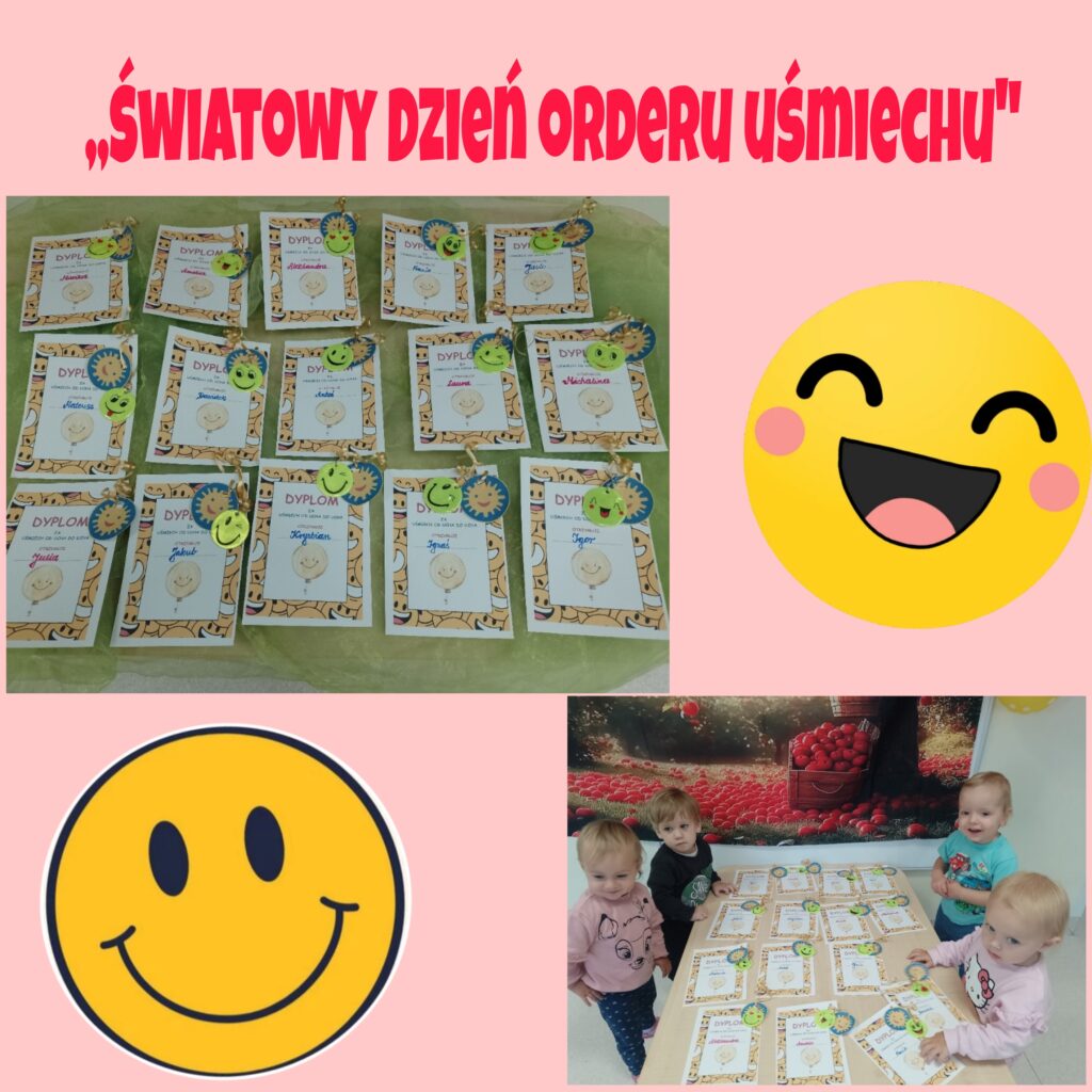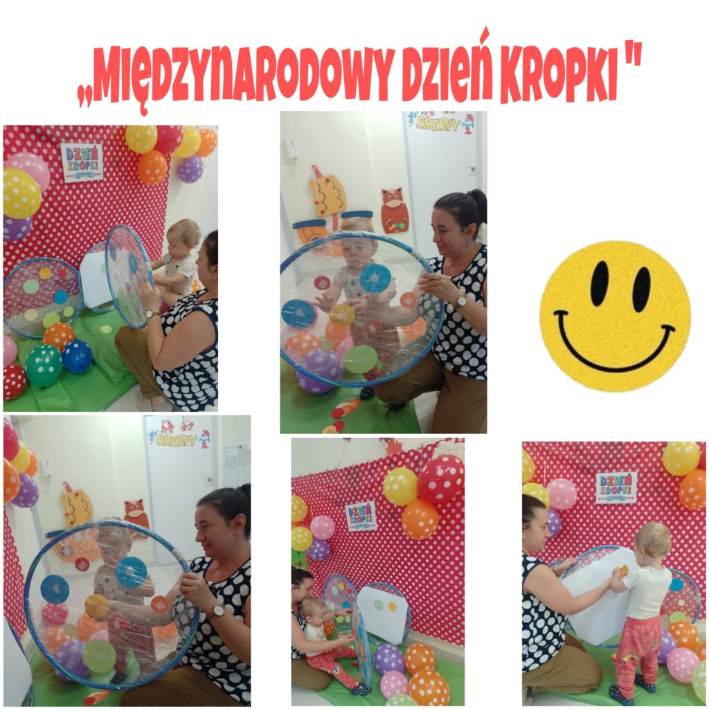 W poniedziałek Smerfiki świętowały ,,Międzynarodowy Dzień Kropki “. Maluszki przyklejały różnej wielkości kolorowe kropki na folię streczową oraz bawiły się kolorowymi balonami w kropeczki. Przenieśliśmy się również w krainę witaminek. W ramach propagowania zdrowego stylu życia wspólnie zrobiliśmy pyszny soczek że świeżych owoców. Dzieci miały możliwość zapoznania się z wyglądem, kształtem oraz smakiem przygotowanych owoców. Natomiast w piątek z okazji ,,Światowego Dnia Orderu Uśmiechu” wykonaliśmy pracę plastyczną pt. ,,Uśmiechnięta Buźka”. Dzieciaczki otrzymały pamiątkowe dyplomy, ordery uśmiechu oraz odblaskowe ,,buźki”. Nie zabrakło zabaw z użyciem kolorowego tunelu, układaliśmy klocki oraz łapaliśmy bańki mydlane. Na zajęciach muzyczno-rytmicznych tańczyliśmy do piosenki pt. ,,Kurka mała”. Przez cały tydzień towarzyszyły nam zabawy przy muzyce oraz proste zabawy na dywanie. To był wesoły tydzień.