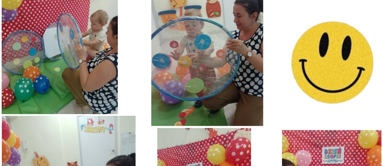 W poniedziałek Smerfiki świętowały ,,Międzynarodowy Dzień Kropki “. Maluszki przyklejały różnej wielkości kolorowe kropki na folię streczową oraz bawiły się kolorowymi balonami w kropeczki. Przenieśliśmy się również w krainę witaminek. W ramach propagowania zdrowego stylu życia wspólnie zrobiliśmy pyszny soczek że świeżych owoców. Dzieci miały możliwość zapoznania się z wyglądem, kształtem oraz smakiem przygotowanych owoców. Natomiast w piątek z okazji ,,Światowego Dnia Orderu Uśmiechu” wykonaliśmy pracę plastyczną pt. ,,Uśmiechnięta Buźka”. Dzieciaczki otrzymały pamiątkowe dyplomy, ordery uśmiechu oraz odblaskowe ,,buźki”. Nie zabrakło zabaw z użyciem kolorowego tunelu, układaliśmy klocki oraz łapaliśmy bańki mydlane. Na zajęciach muzyczno-rytmicznych tańczyliśmy do piosenki pt. ,,Kurka mała”. Przez cały tydzień towarzyszyły nam zabawy przy muzyce oraz proste zabawy na dywanie. To był wesoły tydzień.