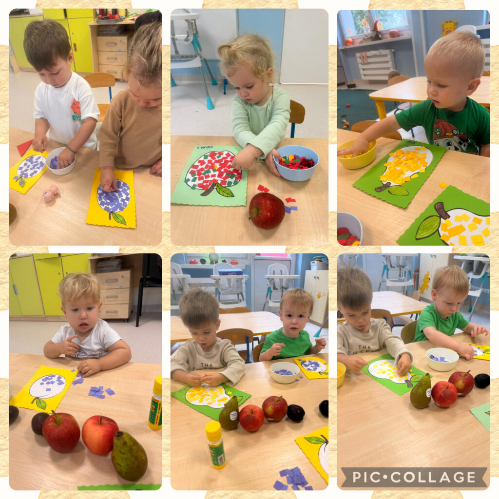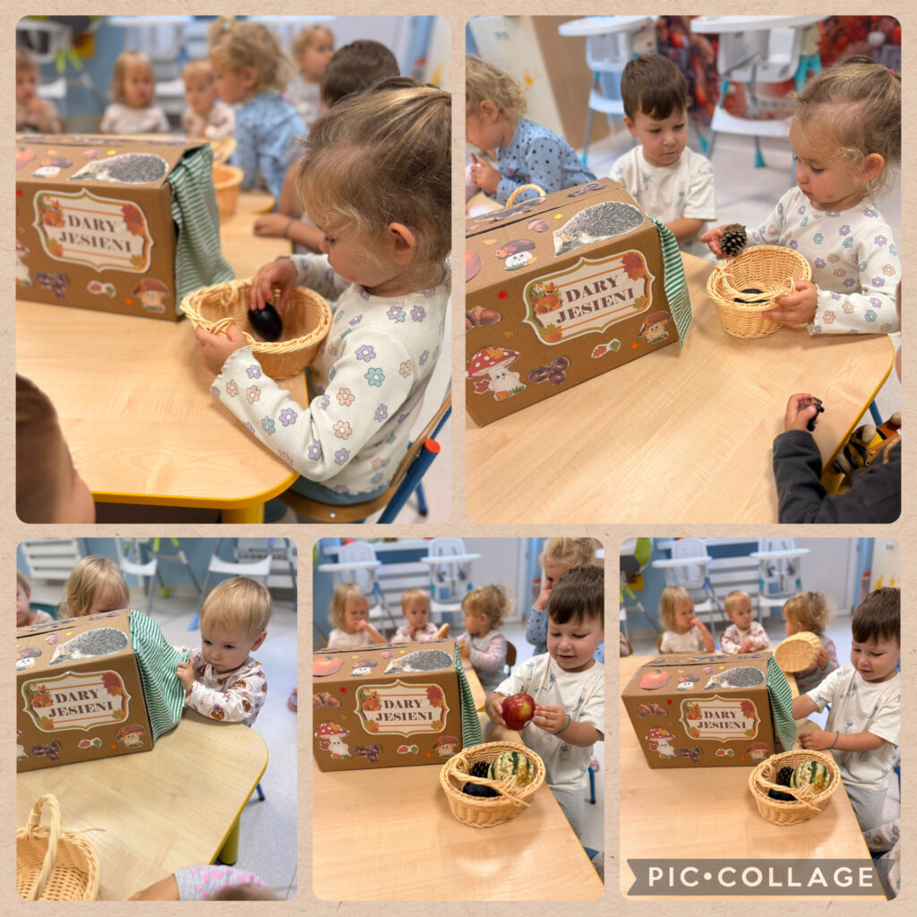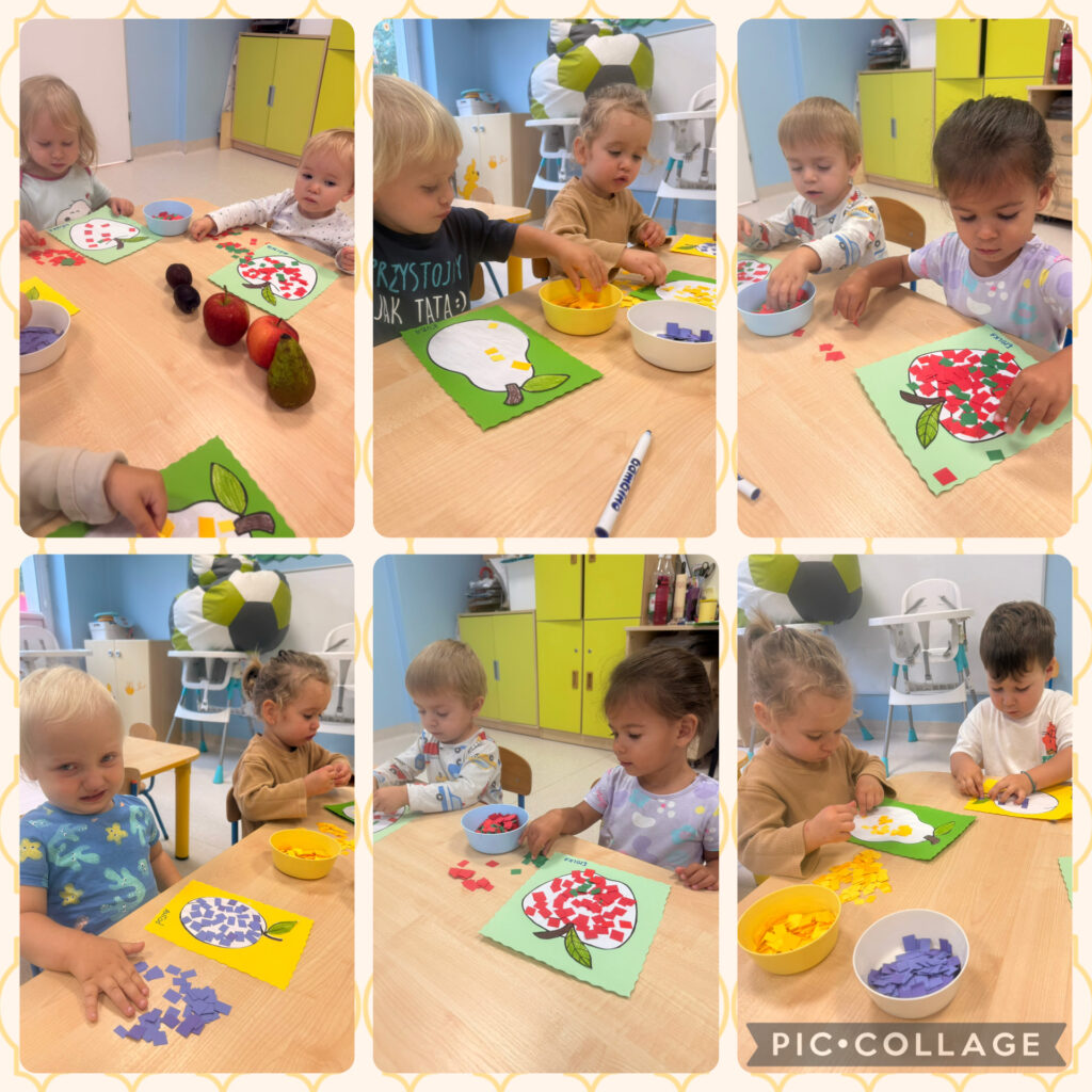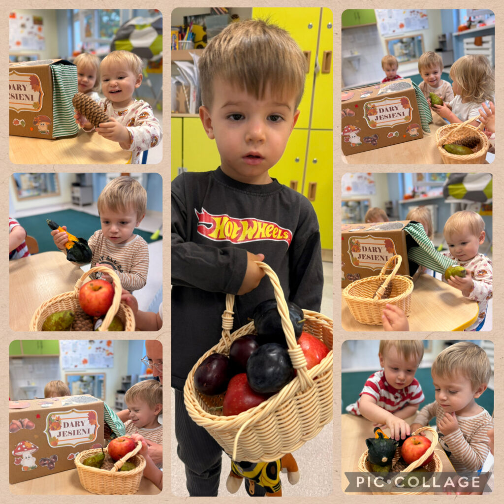 Skrzaty rozpoczęły tydzień radosnym powitaniem nowej pory roku – jesieni, która przybyła do nas z koszem pełnym swoich skarbów. Wspólnie obchodziliśmy Dzień Spadającego Liścia – podrzucaliśmy liście na chuście animacyjnej, dmuchaliśmy w wirujące listki, a na świeżym powietrzu zamiataliśmy je i zbieraliśmy szyszki. Nie zabrakło także twórczości – wykonaliśmy piękną pracę plastyczną „Owoce jesienne”, wyklejając je kolorowym papierem. Dzieci bawiły się również w sortowanie owoców i warzyw, rozwijając spostrzegawczość i umiejętność klasyfikowania. Podczas zajęć muzyczno-rytmicznych tańczyliśmy do jesiennych piosenek, m.in. „Dmucha wiatr”, ucząc się reagowania na tempo oraz naśladowania zjawisk pogodowych – wiatru, deszczu i innych.