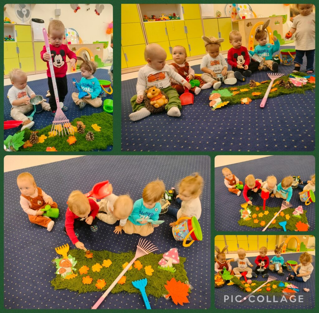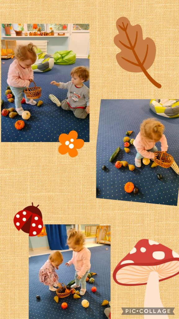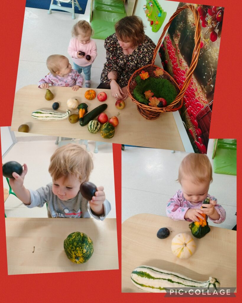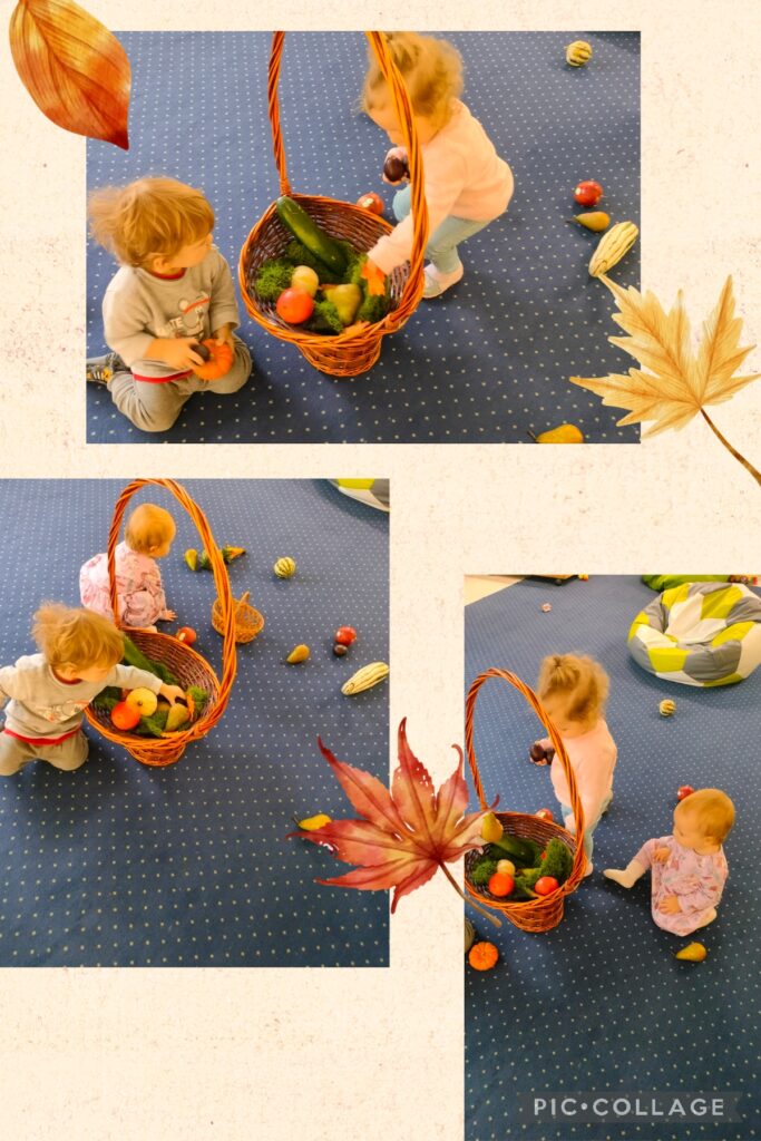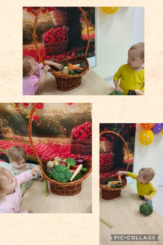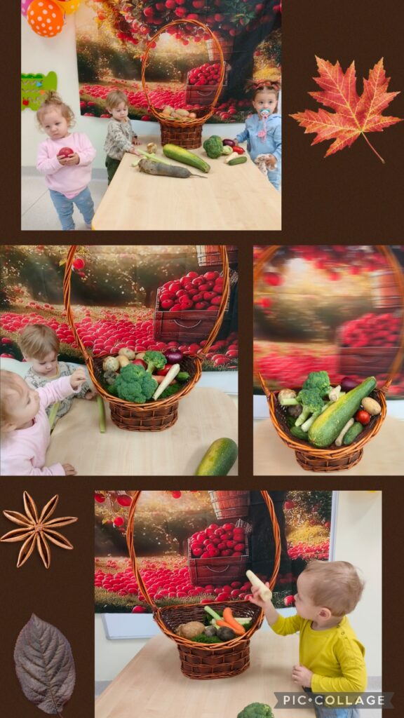 Podczas zajęć „Co nam jesień w koszu niesie?” i „Kosz z warzywami” Smerfiki rozwijały zmysły wzroku, węchu i dotyku, oglądając różnorodne jesienne warzywa.