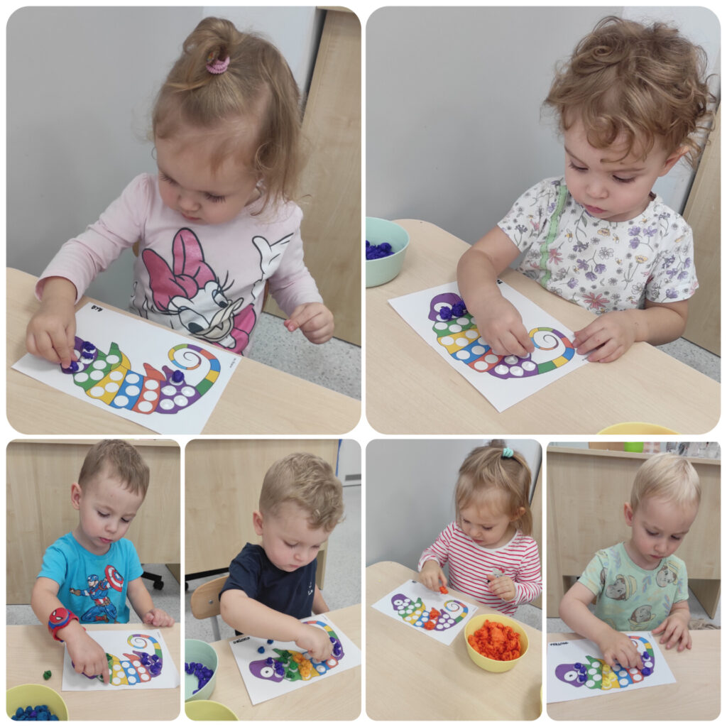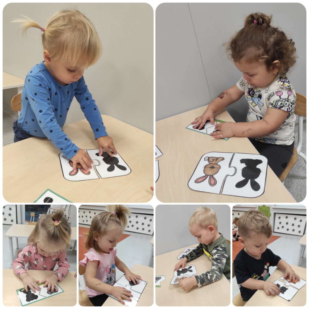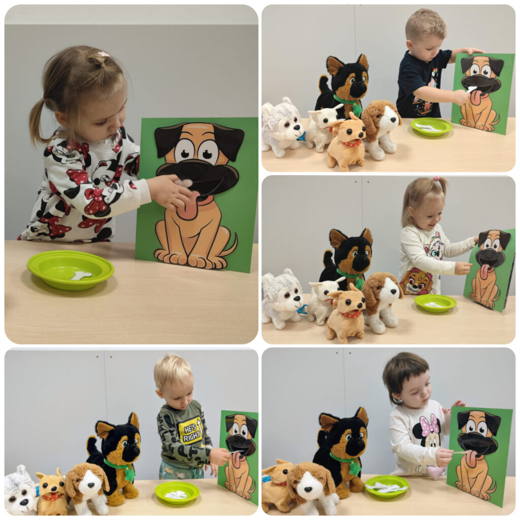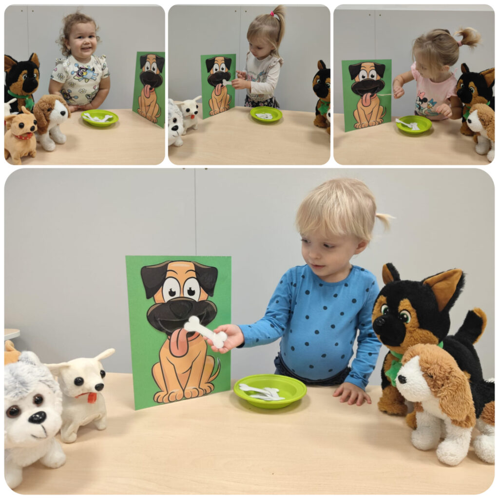 W tym tygodniu Sówki poznały zwierzęta domowe. Poznaliśmy nowe piosenki: „My jesteśmy kotki dwa…”, „Mała Tereska dostała pieska…”, „Pieski małe dwa…”. Wysłuchaliśmy również wiersze o pieskach. Wykonaliśmy pracę plastyczną: wyklejanka. Dopasowywaliśmy również cienie zwierzątek rozwijając percepcję wzrokową. W piątek obchodziliśmy Dzień Kundelka i z tej okazji poznaliśmy nowe piosenki oraz były zabawy tematyczne. W tym tygodniu odbyły się zajęcia z sensoplastyki: Barwne druciki. Przez cały tydzień towarzyszyły nam zabawy muzyczno – ruchowe oraz dowolne zabawy.