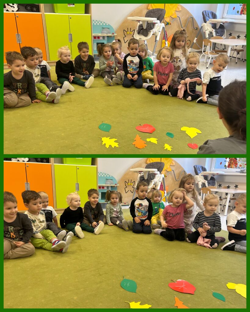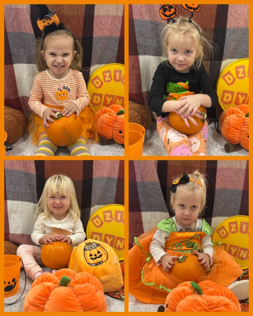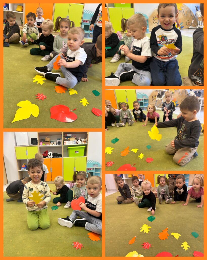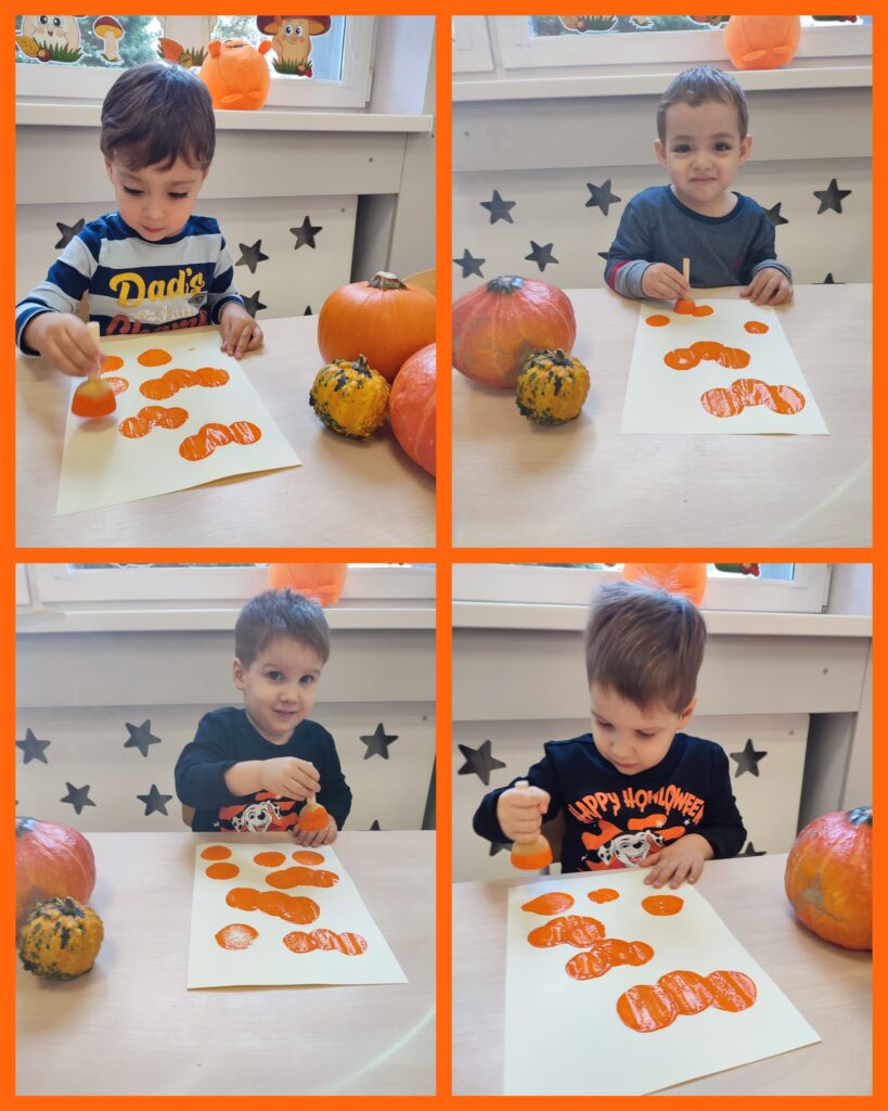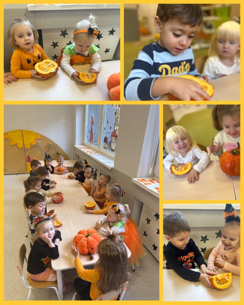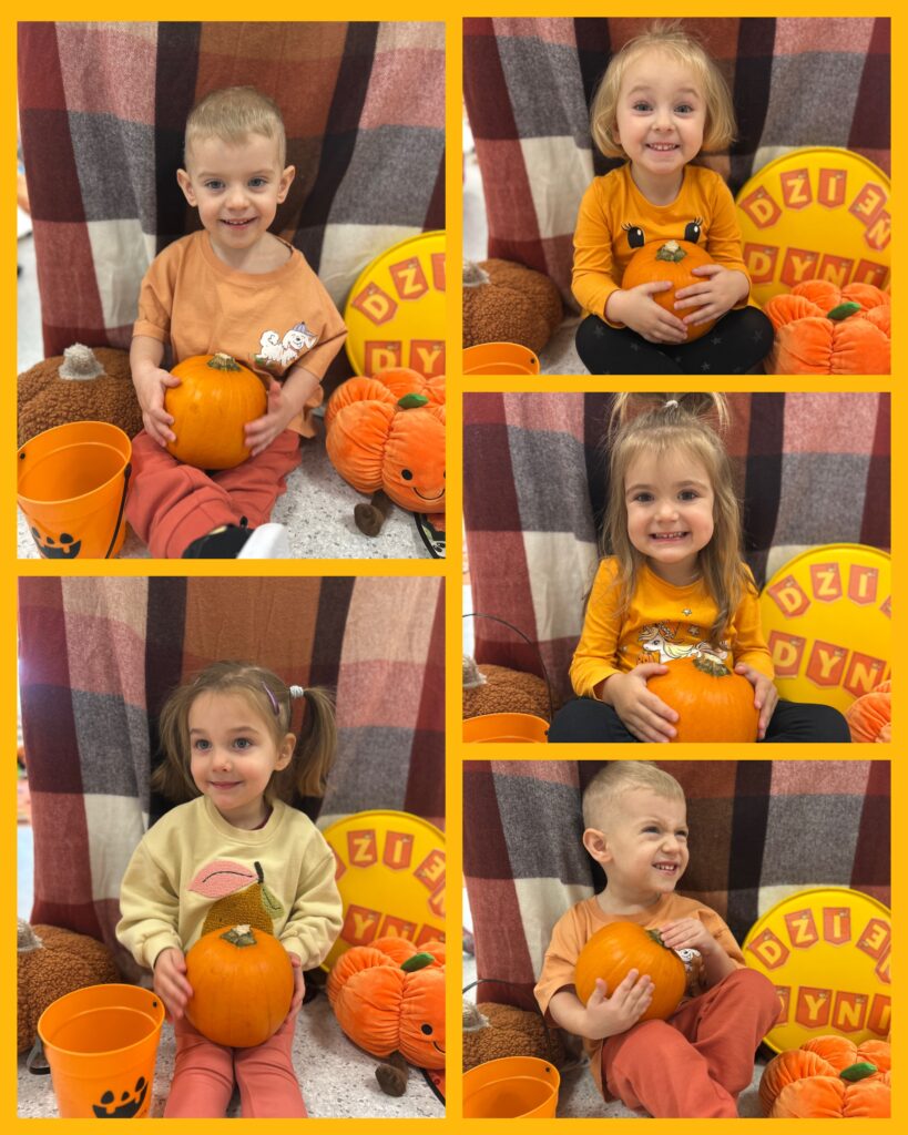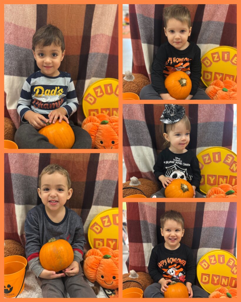 Ostatni tydzień października grupa Zajączków rozpoczęła od zabawy bieżnej z samochodzikami jeżdżącymi w deszczu. Dzieci wsłuchiwały się w odgłosy padającego deszczyku aby potem móc dobrać odpowiedni strój do jesiennej aury. Zajączki utrwalały poznane kolory – żółty, czerwony, zielony – wskazując na różnokolorowe liście. Podczas spacerku ciocie zachęcały Zajączki do naśladowania zjawisk pogodowych i pokazywały jak wieje wiatr. DZIEŃ DYNI był dla Zajęcy okazją do zapoznania się z wyglądem, kolorem i zapachem tego warzywa oraz do wykonania pięknej pracy plastycznej.