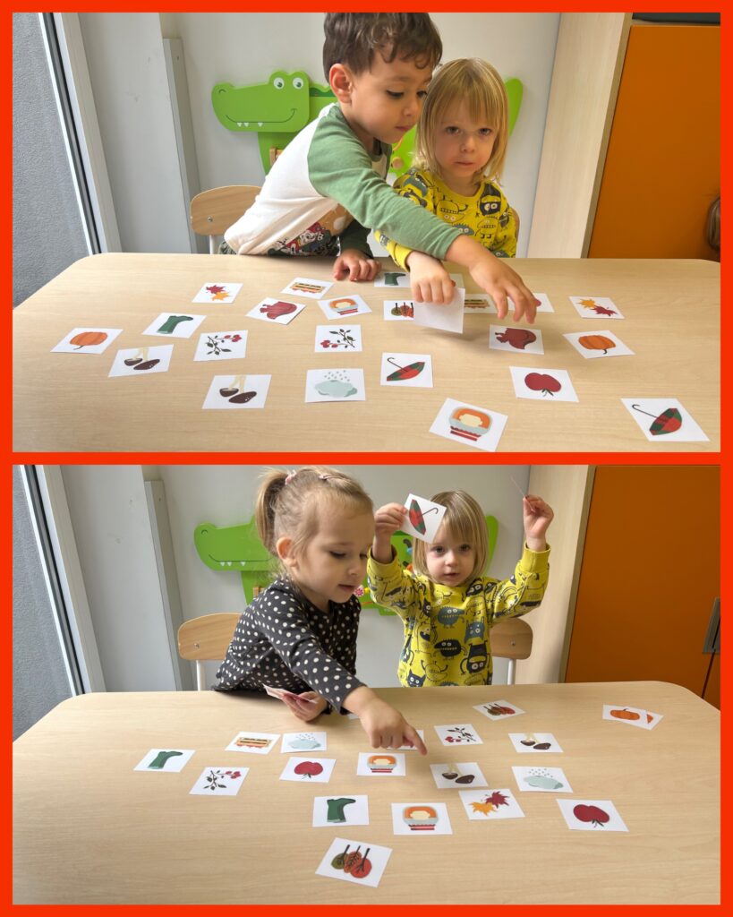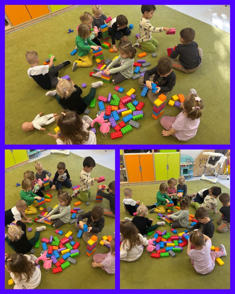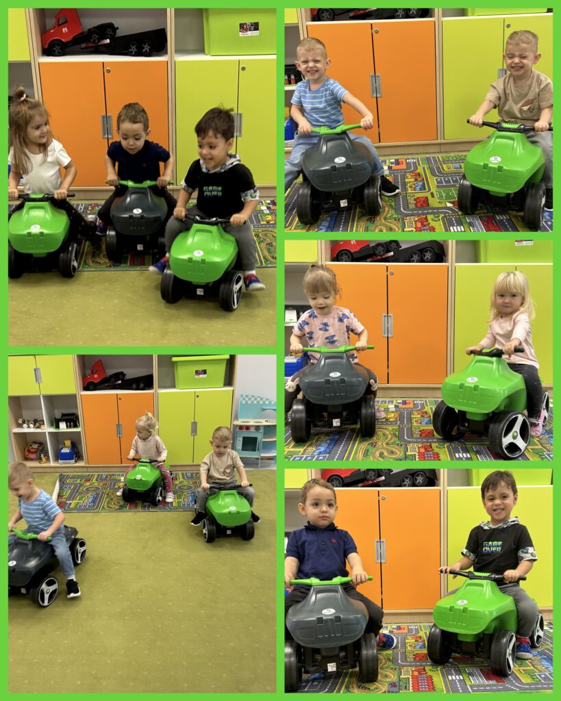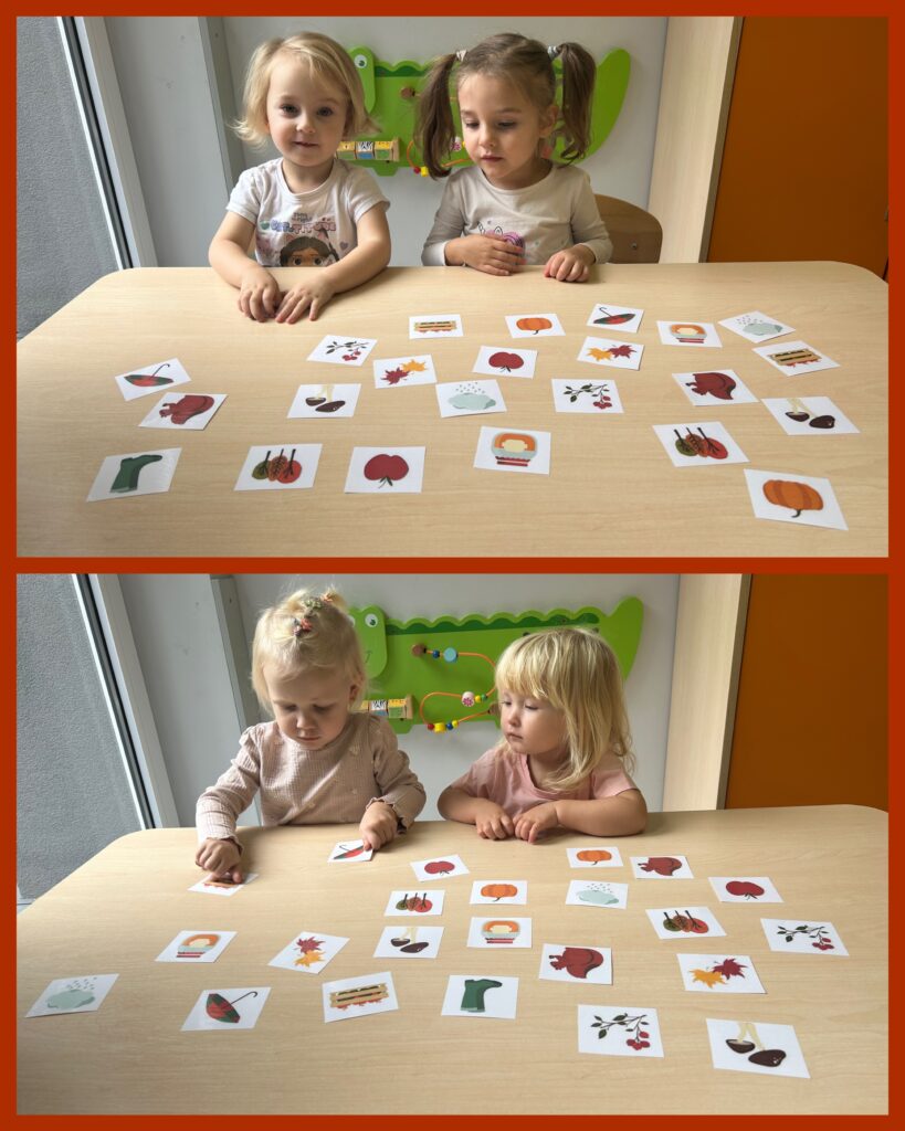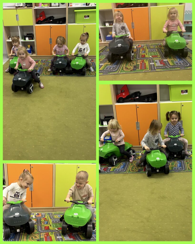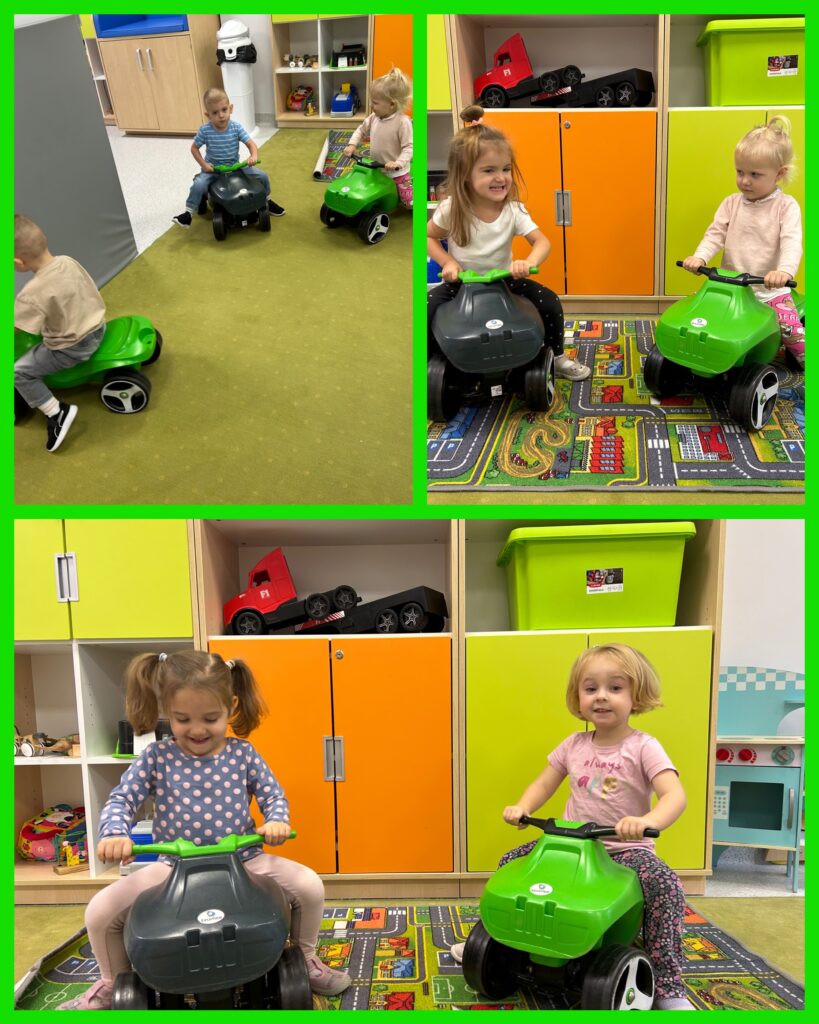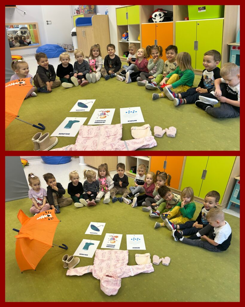 Ostatni tydzień października grupa Zajączków rozpoczęła od zabawy bieżnej z samochodzikami jeżdżącymi w deszczu. Dzieci wsłuchiwały się w odgłosy padającego deszczyku aby potem móc dobrać odpowiedni strój do jesiennej aury. Zajączki utrwalały poznane kolory – żółty, czerwony, zielony – wskazując na różnokolorowe liście. Podczas spacerku ciocie zachęcały Zajączki do naśladowania zjawisk pogodowych i pokazywały jak wieje wiatr. DZIEŃ DYNI był dla Zajęcy okazją do zapoznania się z wyglądem, kolorem i zapachem tego warzywa oraz do wykonania pięknej pracy plastycznej.