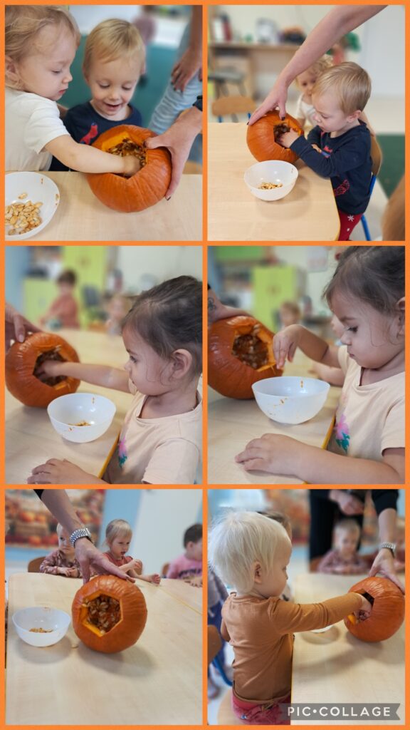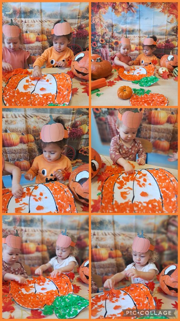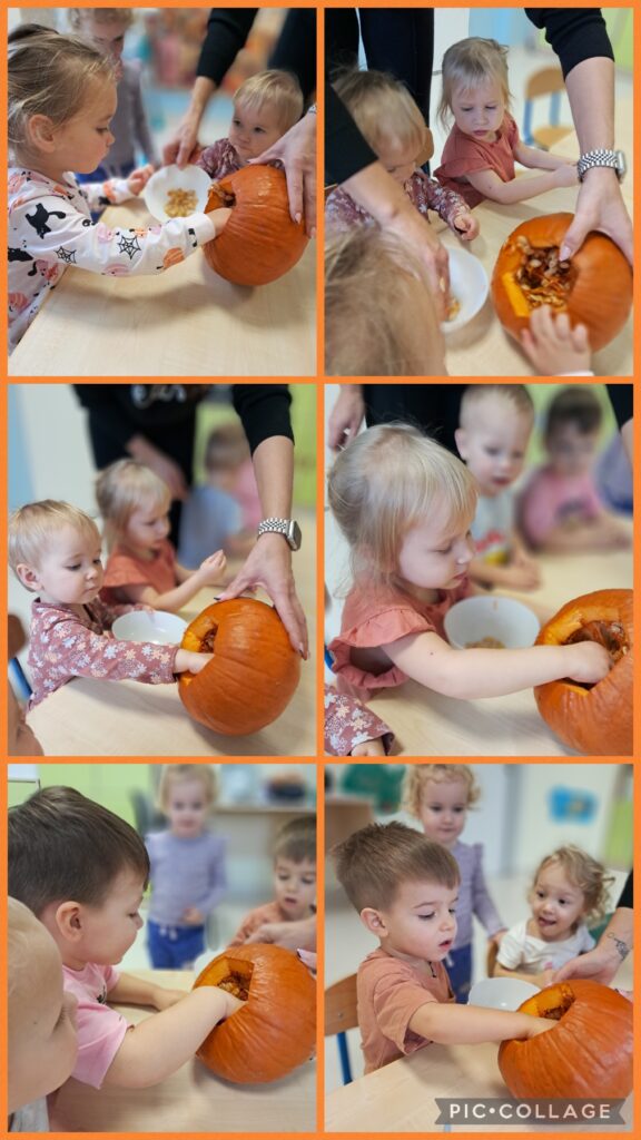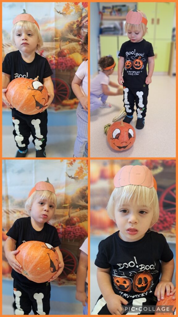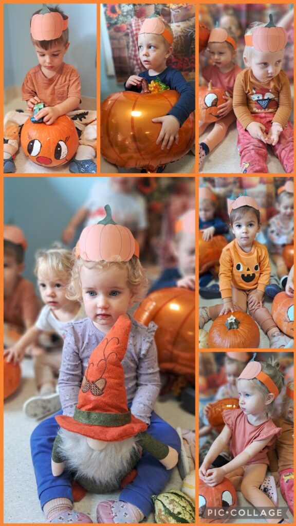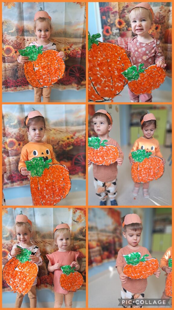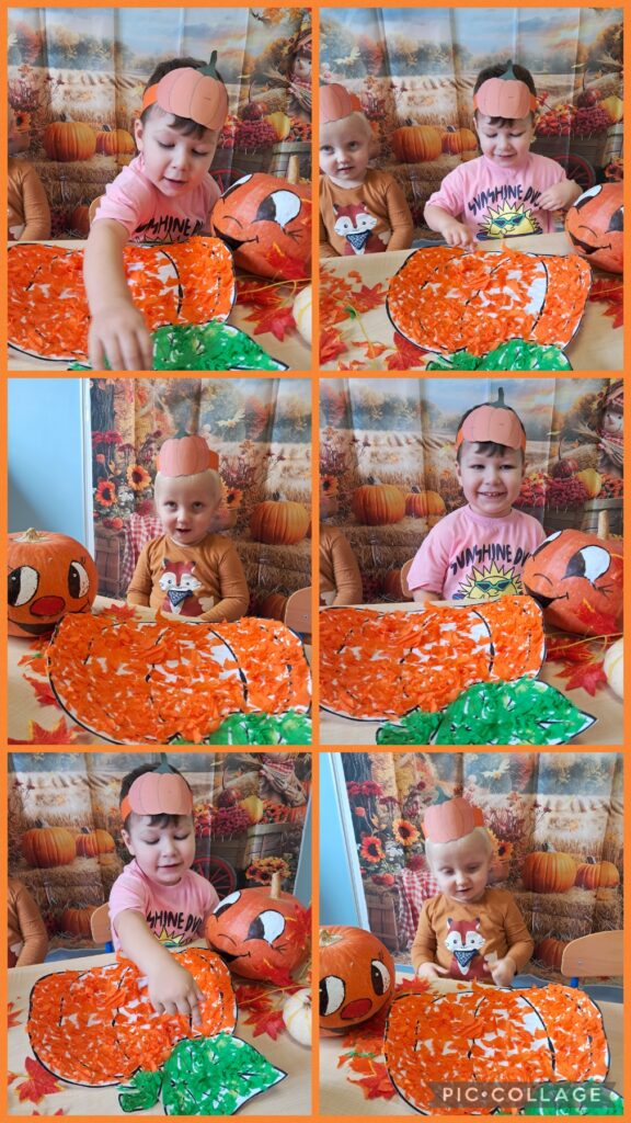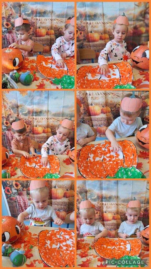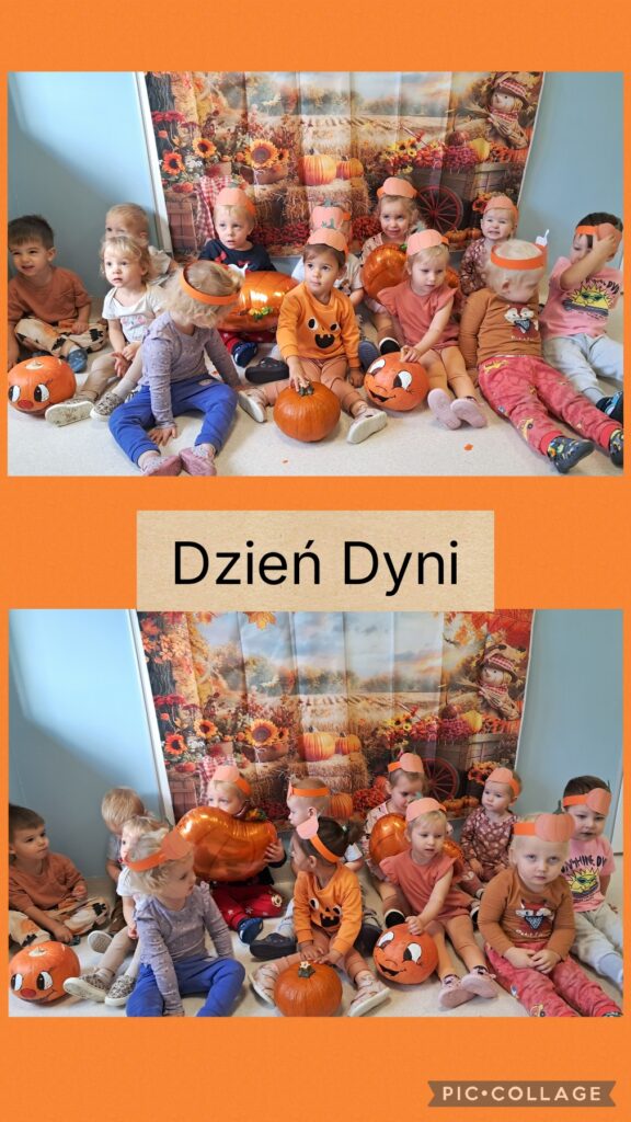 Obchodziliśmy również Dzień dyni. Z tej okazji wykonaliśmy wspólnie pracę plastyczną wyklejając dynie oraz zapoznaliśmy się z wyglądem, kolorem i zapachem dyni.