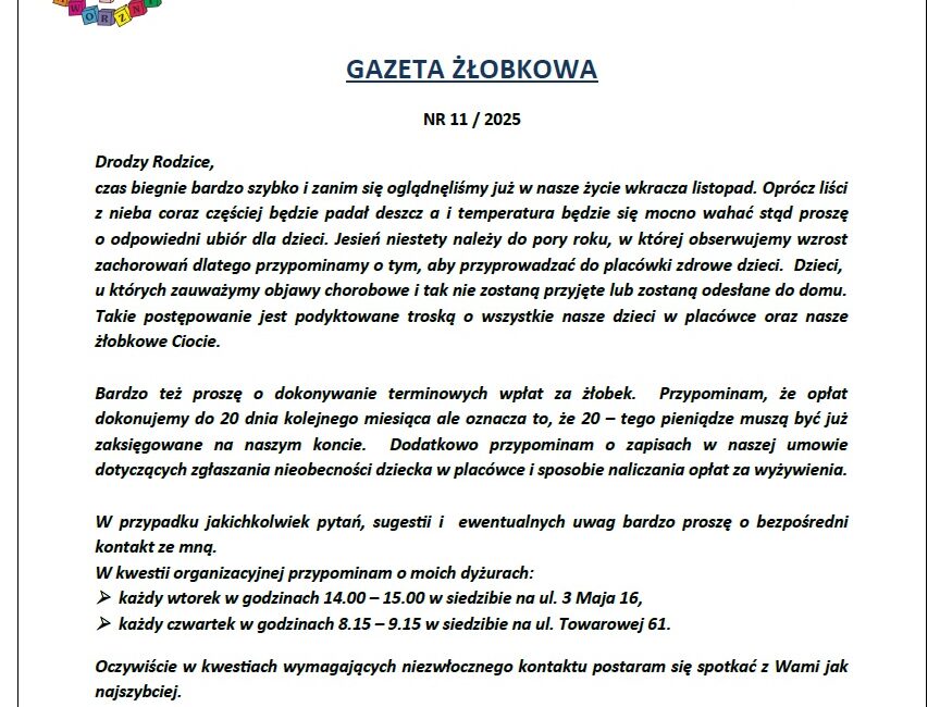 Nasz nowy numer Gazetki żłobkowej nr 11/2025 jest już dostępny w obu placówkach oraz na stronie internetowej w zakładce “pliki do pobrania”.