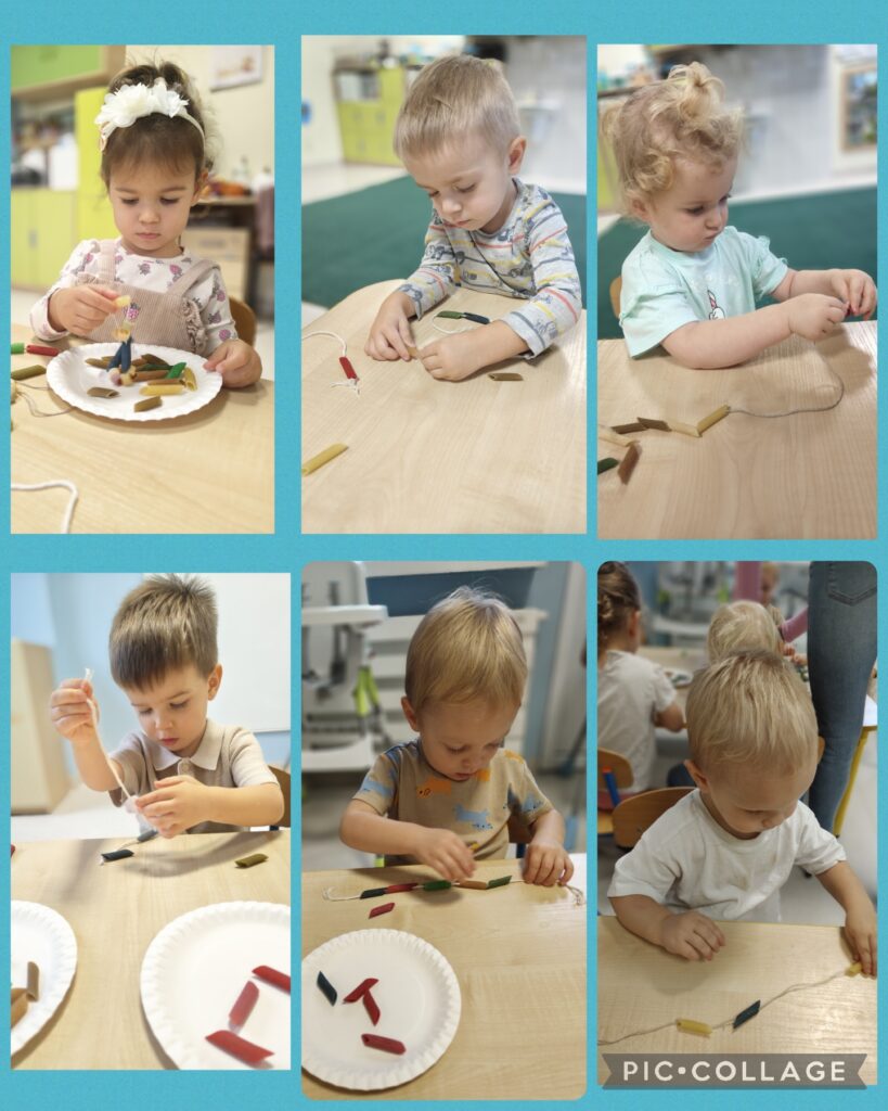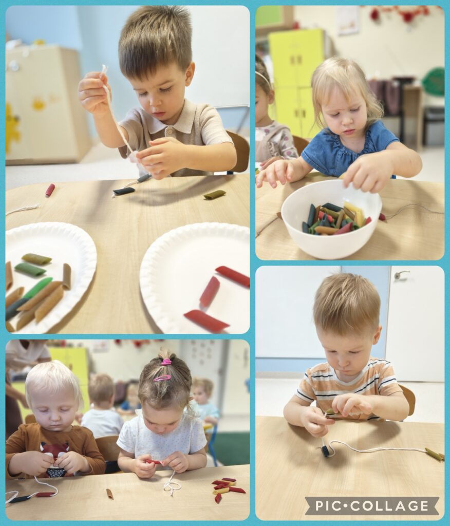 Podczas działań manipulacyjnych dzieci rozwijały motorykę małą, m.in. poprzez nawlekanie makaronu “dla Kopciuszka”.