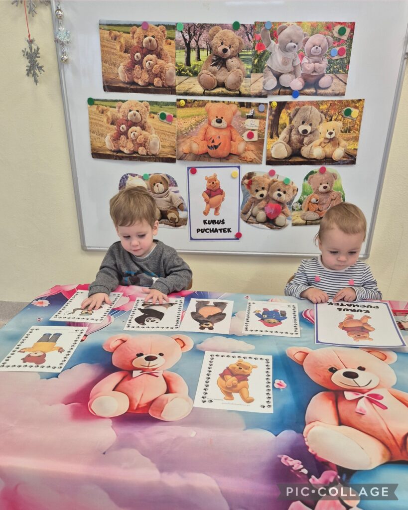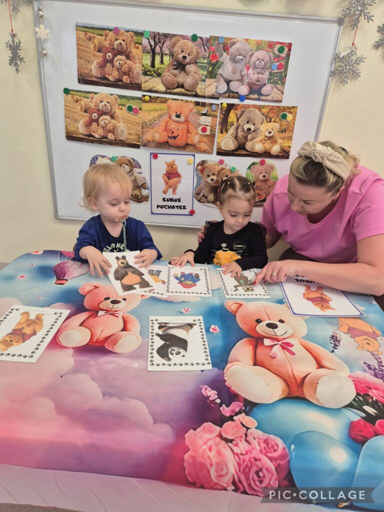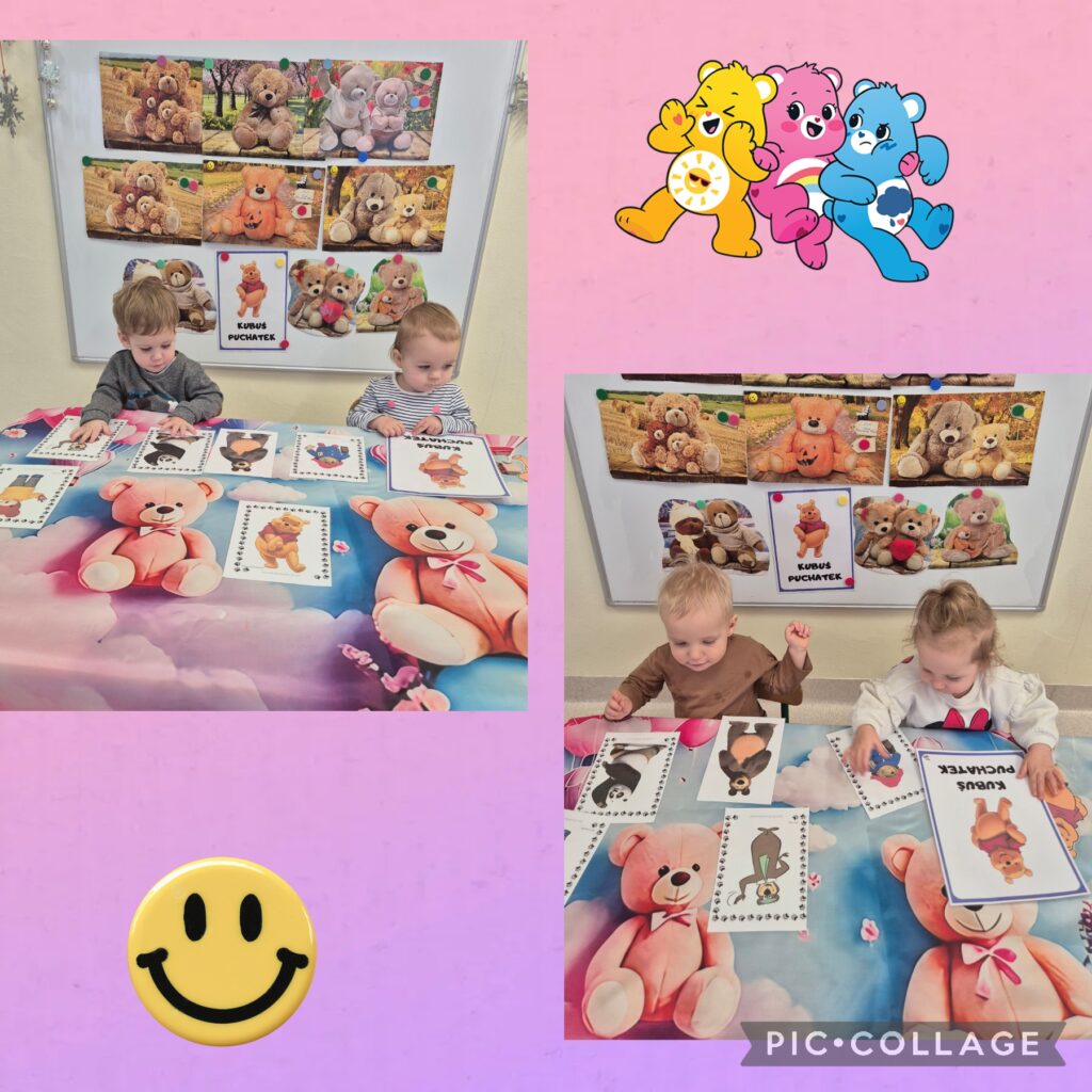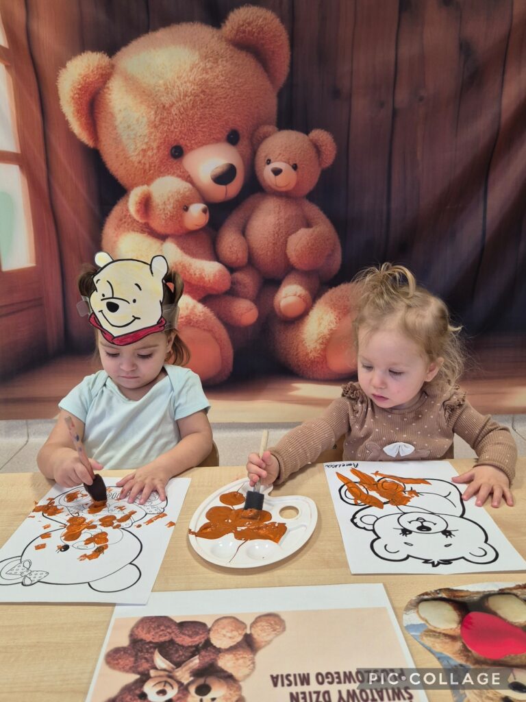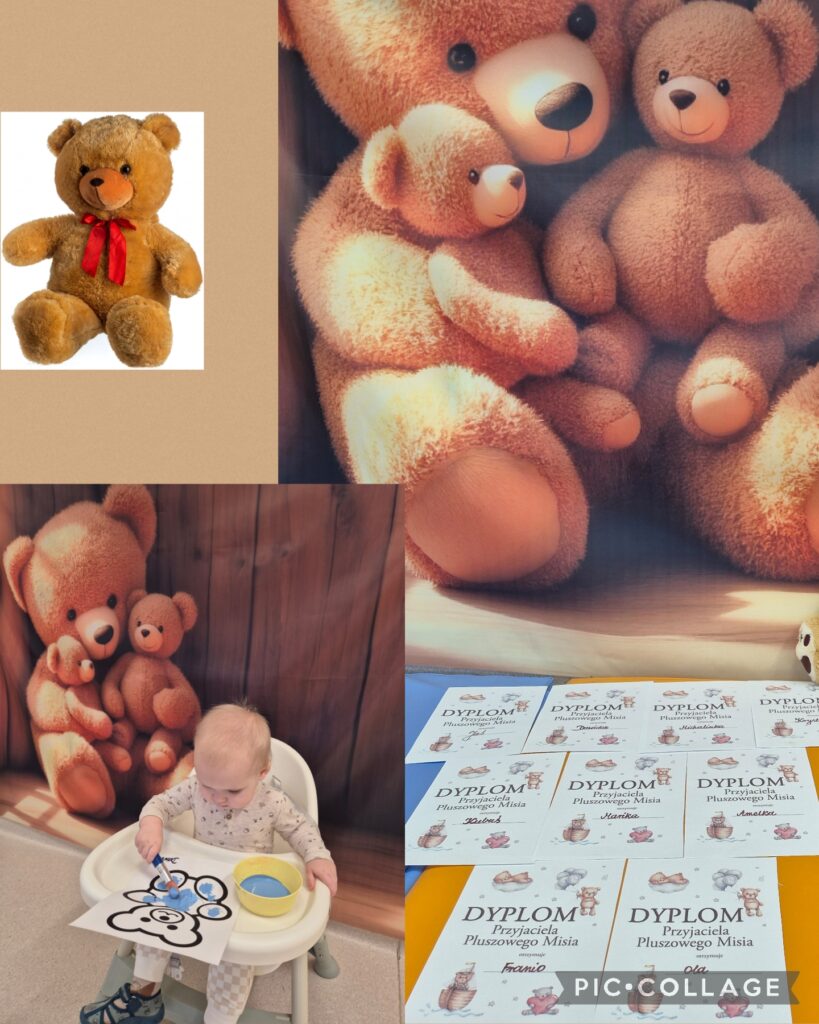 W tym tygodniu obchodziliśmy „Dzień pluszowego misia”. Dzieci zapoznały się z wyglądem misia, wskazywaliśmy jego części ciała oraz ubieraliśmy misia, ćwicząc przy tym sprawność manualną rączek. Czytaliśmy także misiowe bajki i wierszyki jak również poznaliśmy misie z różnych bajek. Z tej okazji dzieci wykonały pracę plastyczną ,,kolorowego misia”, a także wzięły udział w mini sesji zdjęciowej. Na zajęciach sensoplastycznych opiekunki przykleiły na kole taśmę tworząc kilka pętli do których dzieci przyklejały kolorowe piłeczki. Smerfiki rozwijały koordynację wzrokowo-ruchową. W piątek odbyła się u nas zabawa andrzejkowa. Było magicznie i wesoło, zabawa sprawiła smerfikom dużo radości.