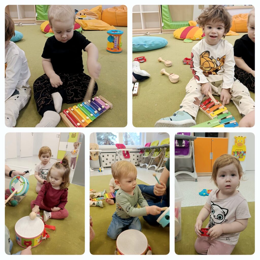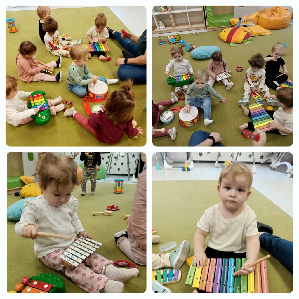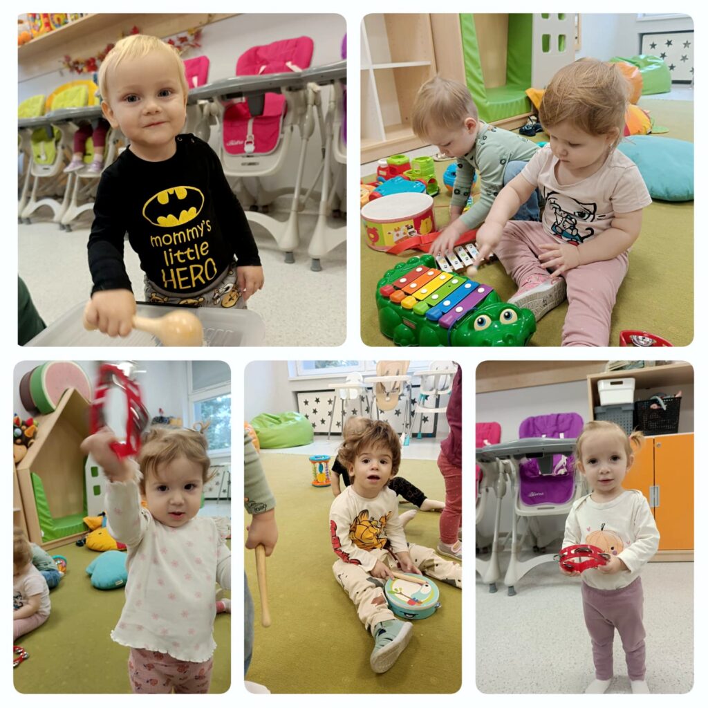 Doskonaliliśmy także poczucie rytmu grając na instrumentach. Było bardzo wesoło a zarazem głośno. Zajęcia dostarczyły Jeżykom i ciociom wielu wrażeń słuchowych.