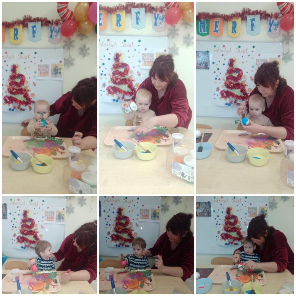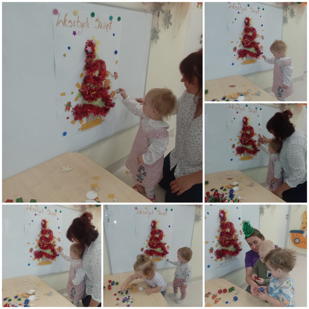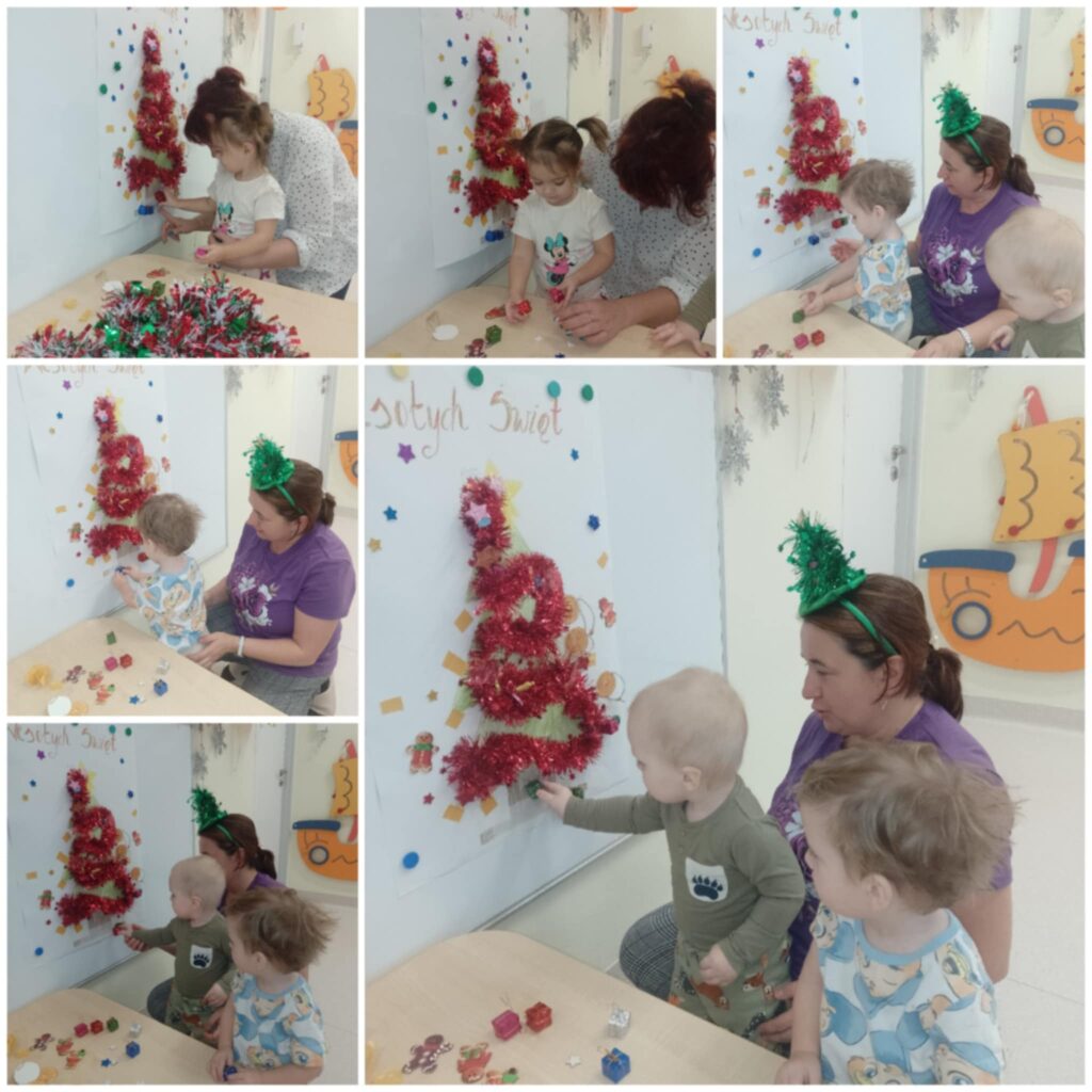 W tym tygodniu Smerfiki zapoznały się z tematyką świąteczną, symbolami oraz zwyczajami bożonarodzeniowymi. Utrwalaliśmy kolor zielony poprzez zabawę oraz rozwijaliśmy wyobraźnię przestrzenną układając klocki. Wspólnie ubieraliśmy choinkę poznając kolorowe ozdoby świąteczne. Dzieci wykonały pracę plastyczną „Kolorowe bombki” malując farbami i posypując brokatem styropianowe