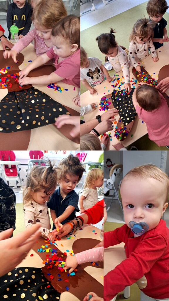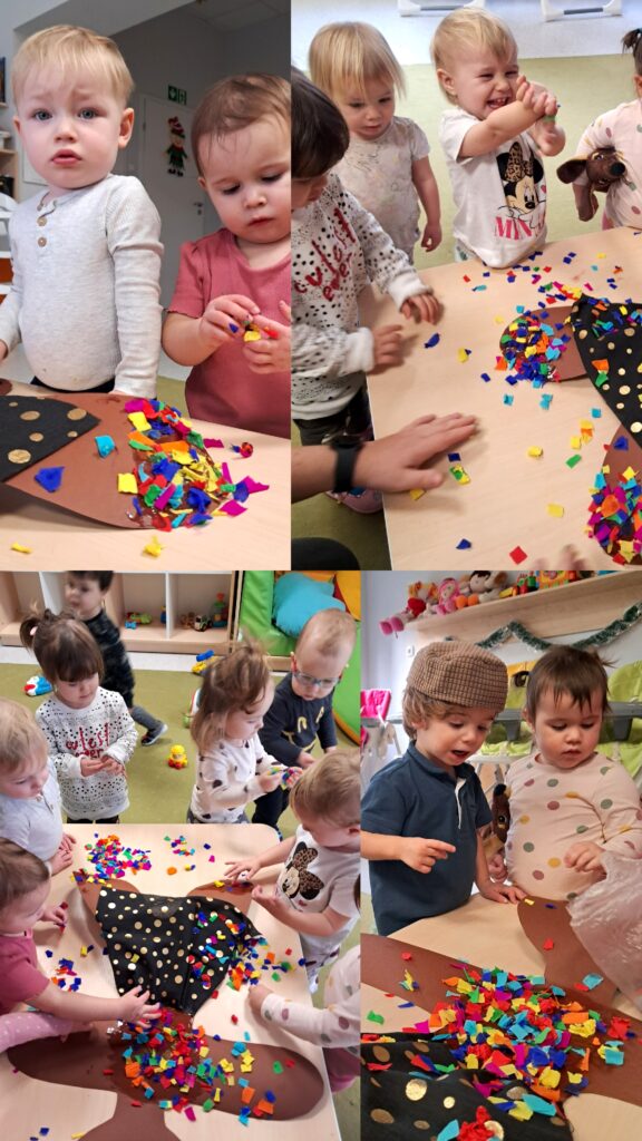 Na zajęciach z sensoplastyki ozdabialiśmy kawałkami kolorowej bibuły piernikowego ludzika.
