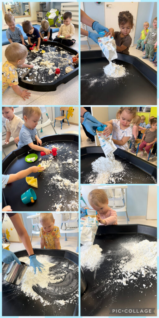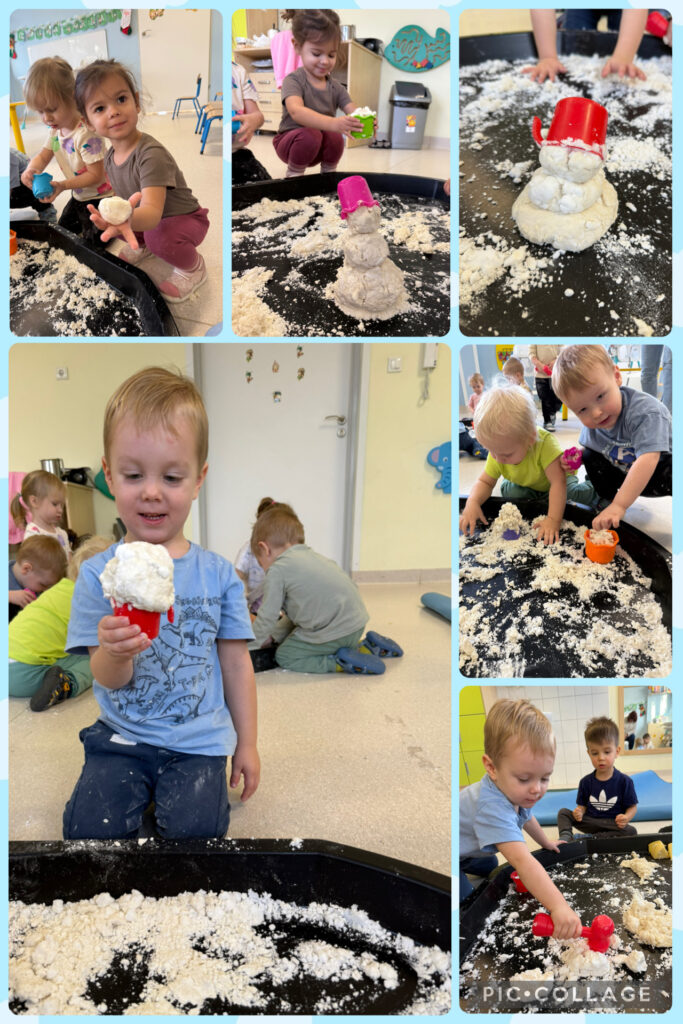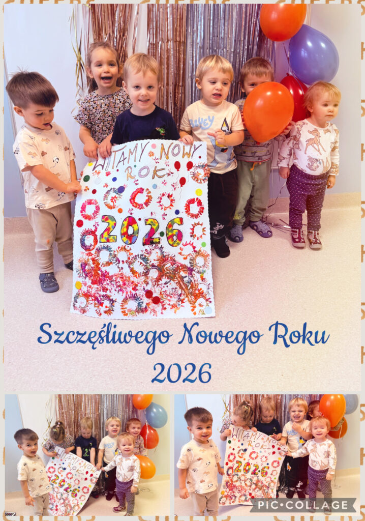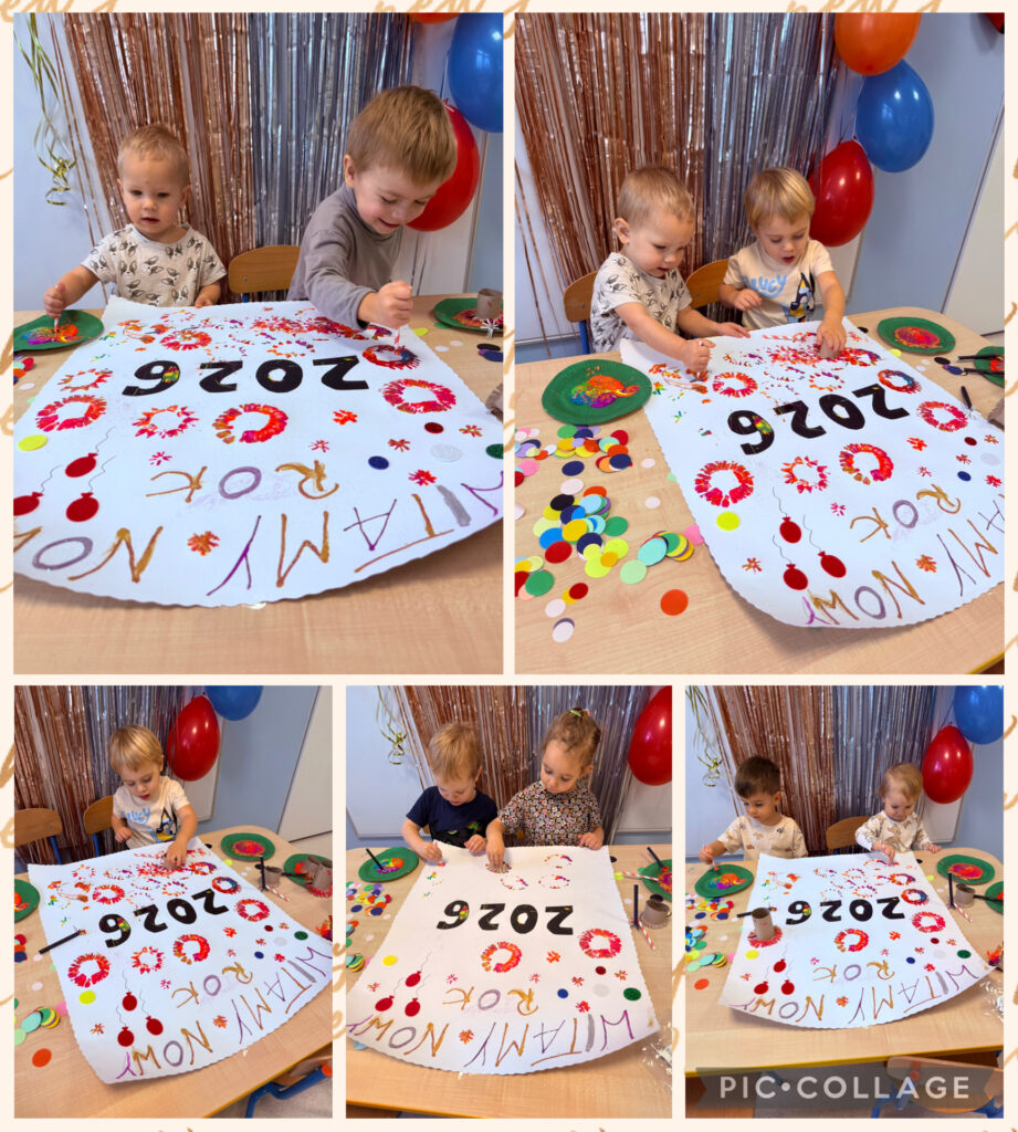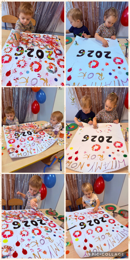 W ostatnich dniach dzieci uczestniczyły w zajęciach o tematyce noworocznej, podczas których brały udział w różnorodnych aktywnościach ruchowych, muzycznych, plastycznych i sensorycznych. Poprzez zabawy z balonami i confetti, działania konstrukcyjne oraz ćwiczenia ruchowe dzieci rozwijały sprawność fizyczną i umiejętność współpracy. W ramach zajęć plastycznych dzieci wykonały pracę: Fajerwerki, natomiast podczas zajęć sensoplastycznych eksperymentowały z mąką ziemniaczaną i wodą. Dzieci tworząc sztuczny śnieg rozwijały zmysły, kreatywność oraz sprawność manualną.