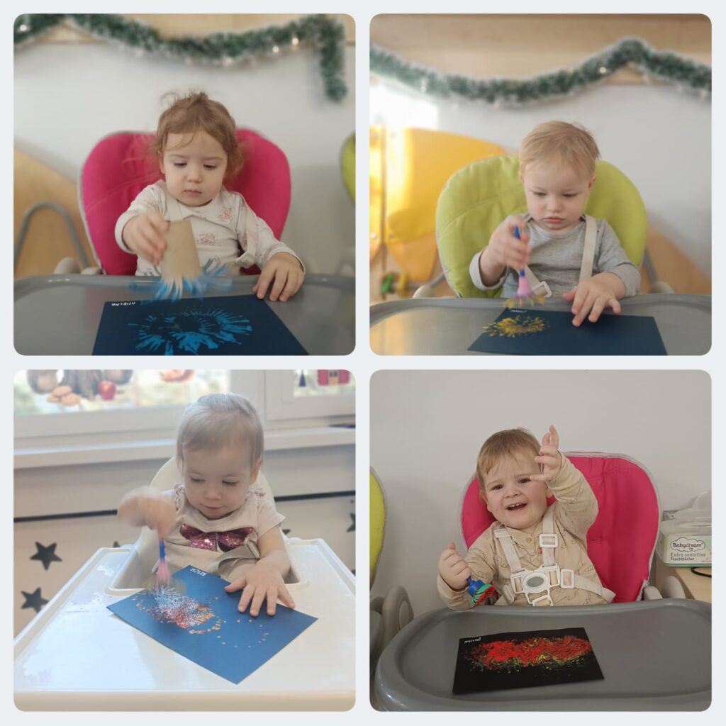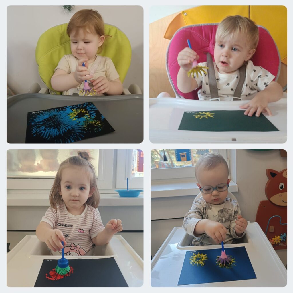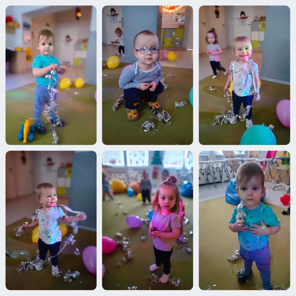 W tym tygodniu Jeżyki zapoznawały się z tradycją witania Nowego Roku. Wraz z ciociami tworzyliśmy pracę plastyczną: Fajerwerki. Słuchaliśmy piosenek, bawiliśmy się balonikami i confetti. Był to bardzo radosny i miły dzień pełen tańca i dobrej zabawy. Tworzyliśmy pociąg, którym wyruszyliśmy w podróż po sali.