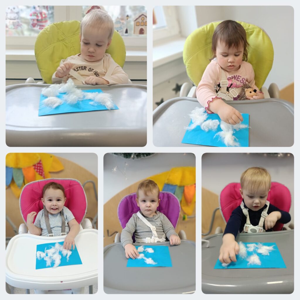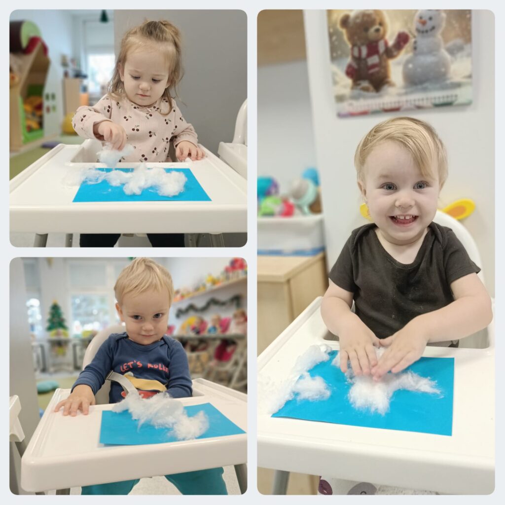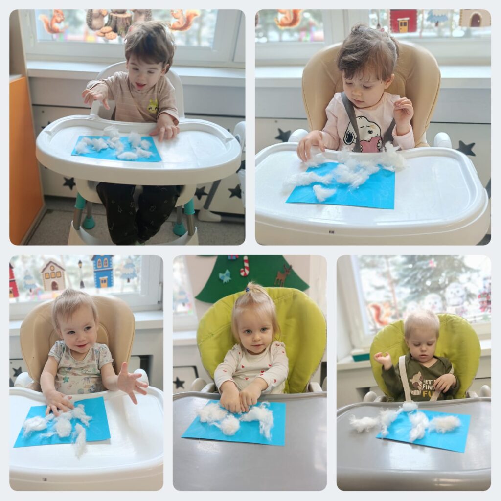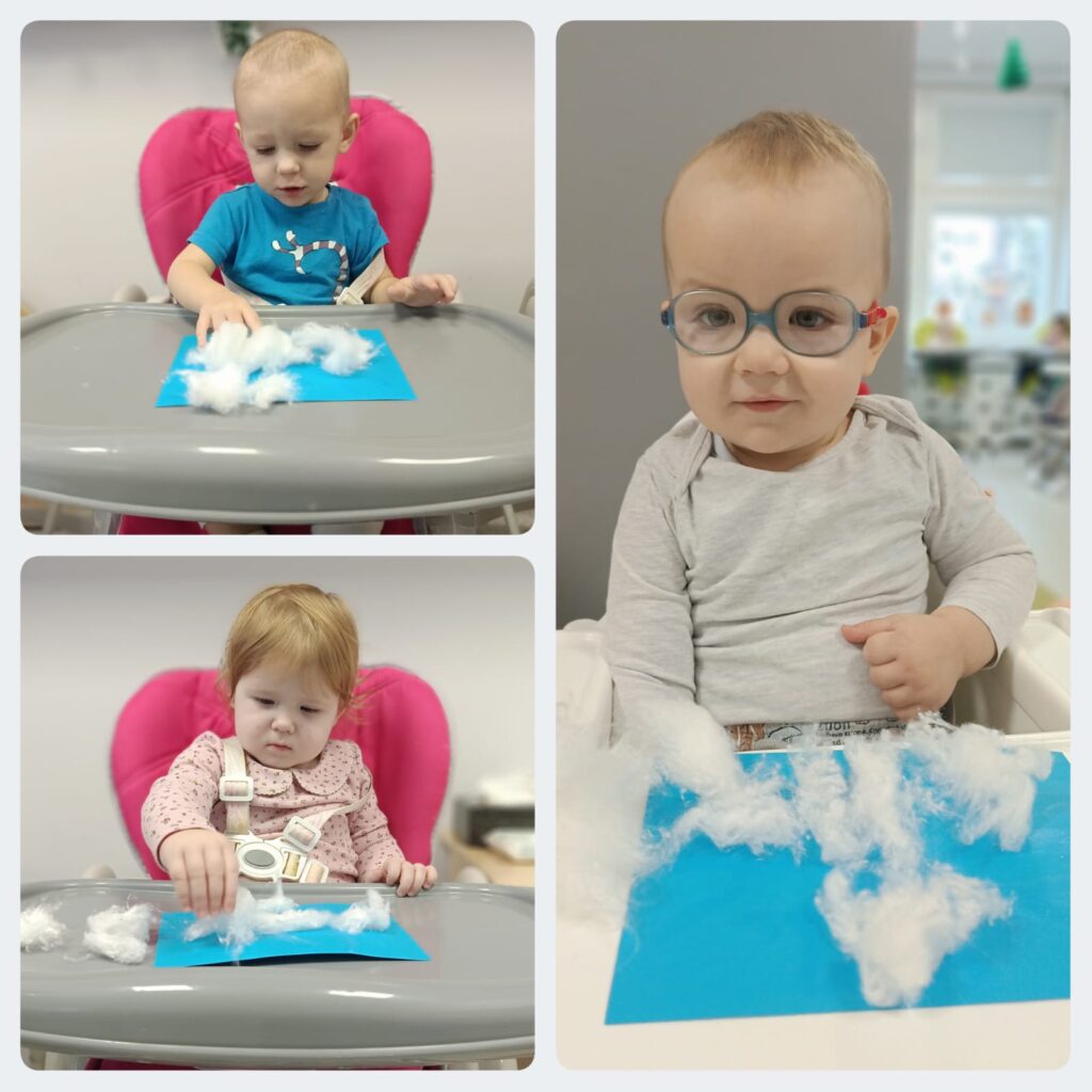 Wykonaliśmy także z pracę plastyczną: śnieżynkę. Na kartce papieru naklejając kawałki waty stworzyliśmy płatek śniegu. Był to bardzo kreatywnie spędzony czas.