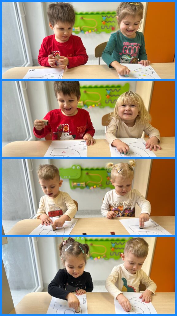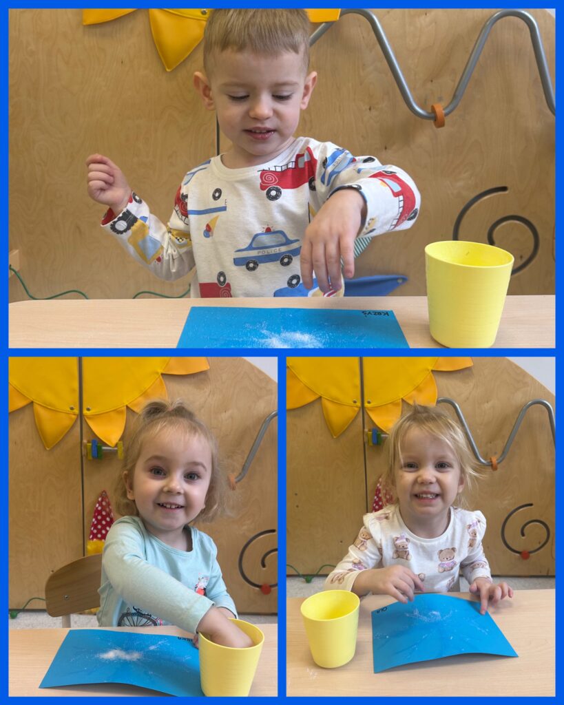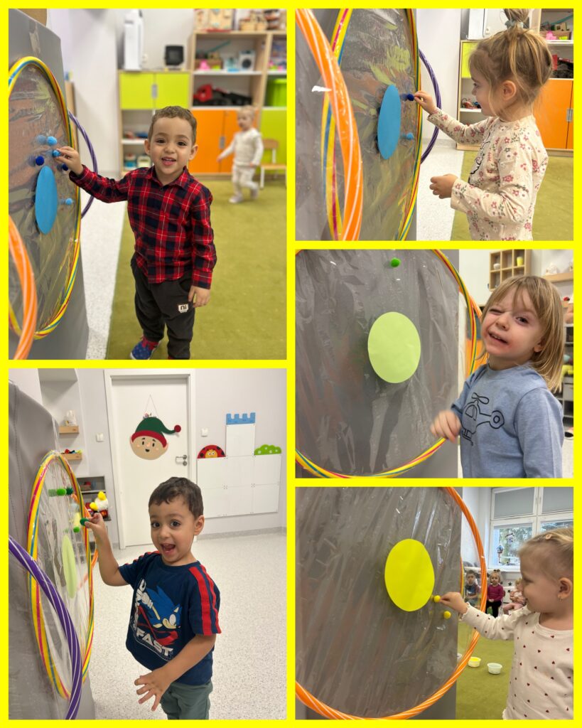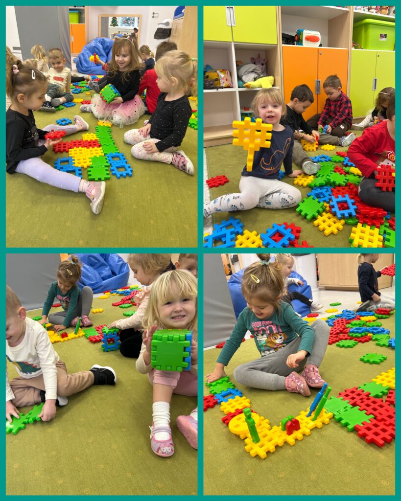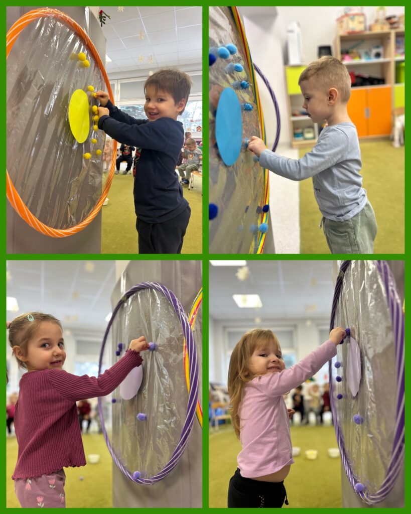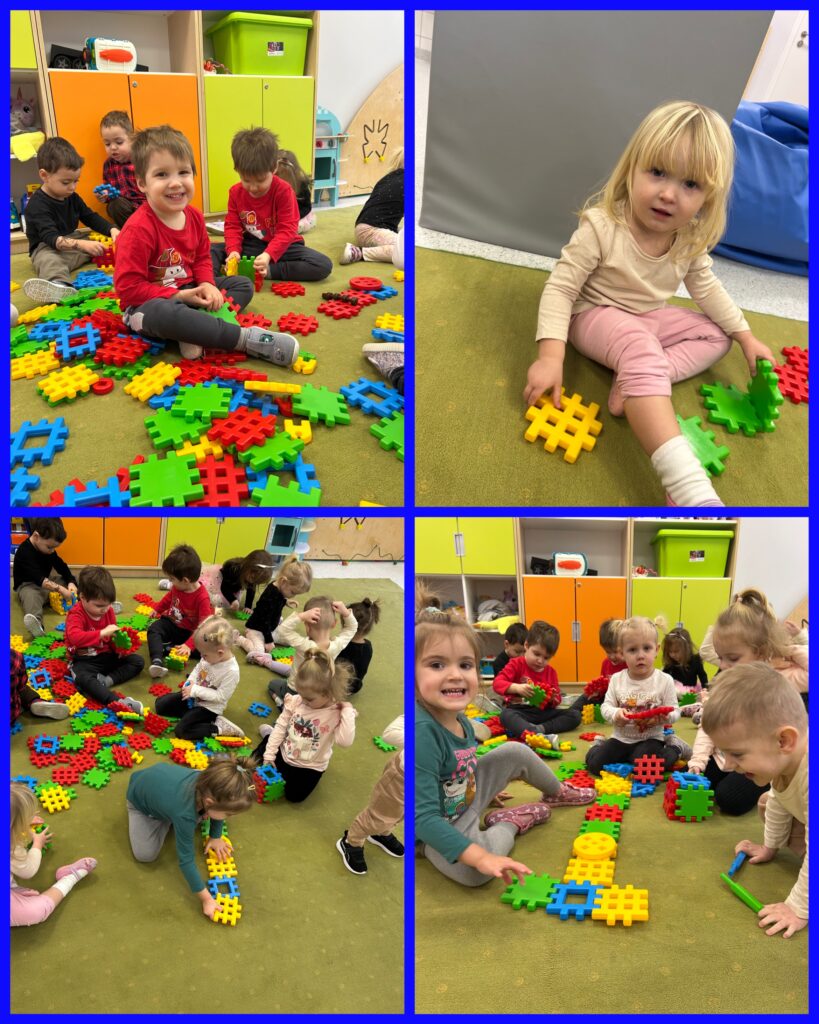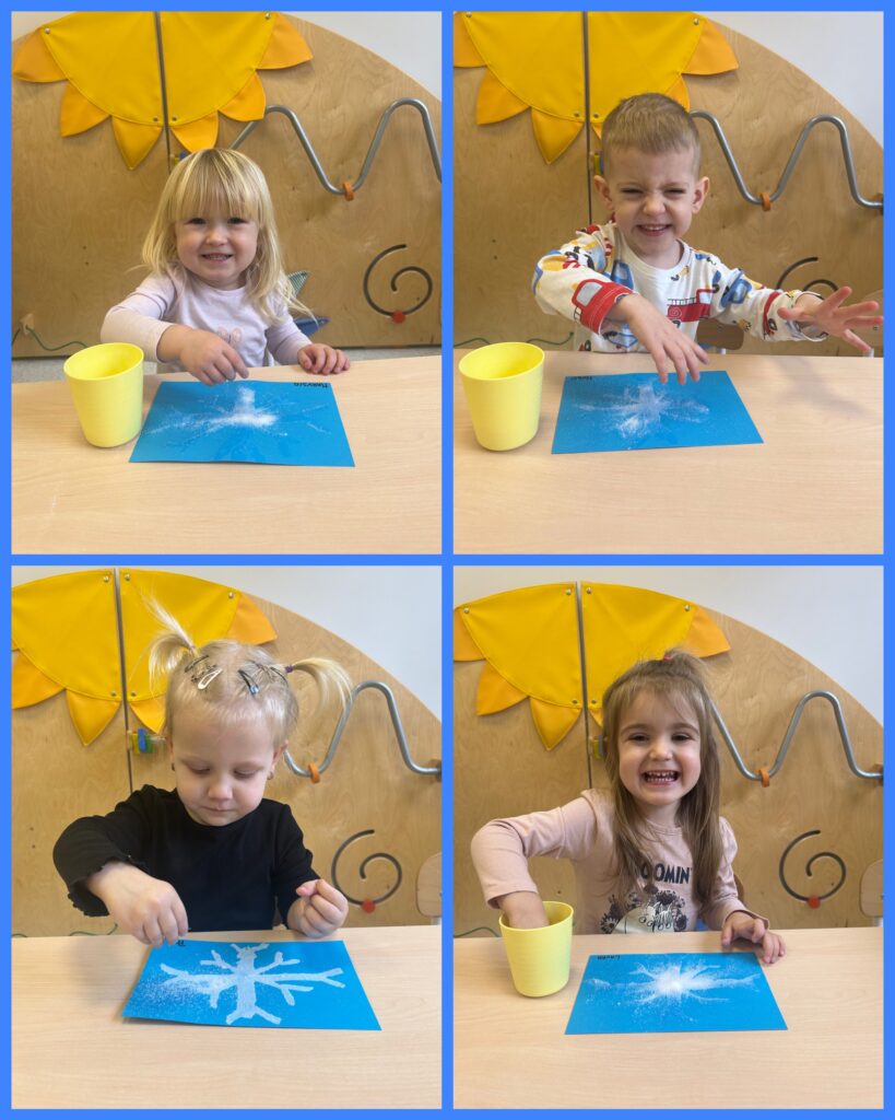W pierwszym tygodniu Nowego Roku Zajączki rozwijały swoją wyobraźnię poprzez poznanie zabaw zimowych. Śnieżna i mroźna sceneria za oknem była tematem wielu rozmów dotyczących licznych atrakcji: bitw na śnieżki, jazdy na sankach, kuligu. Dzieci wykonały pracę plastyczną: śnieżynkę. Na papierowych szalikach Zajączki tworzyły wzory stemplowe o tematyce świątecznej. Słuchaliśmy wielu piosenek zimowych i poznaliśmy nową „Zima zła”. Odbyły się zajęcia sensoplastyczne – kolorowe koła. Dzieci na kole z przygotowaną wcześniej przyklejoną taśmą umieszczały kolorowe mięciutkie piłeczki, utrwalając i poznając nowe kolory.