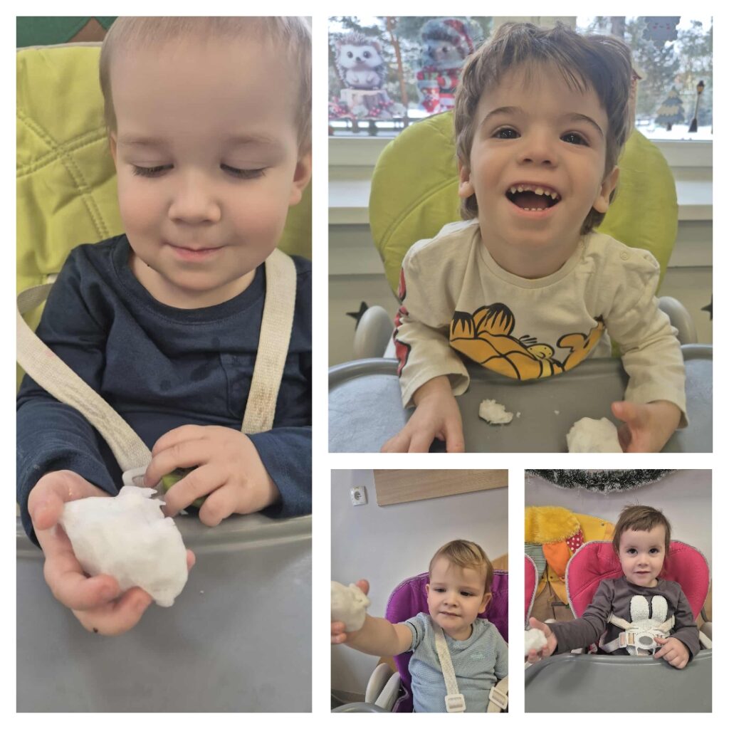 W środę przypominaliśmy nazwy poznanych warzyw i owoców. Masując rączki piłeczkami z wypustkami rozwijaliśmy zmysł dotyku.