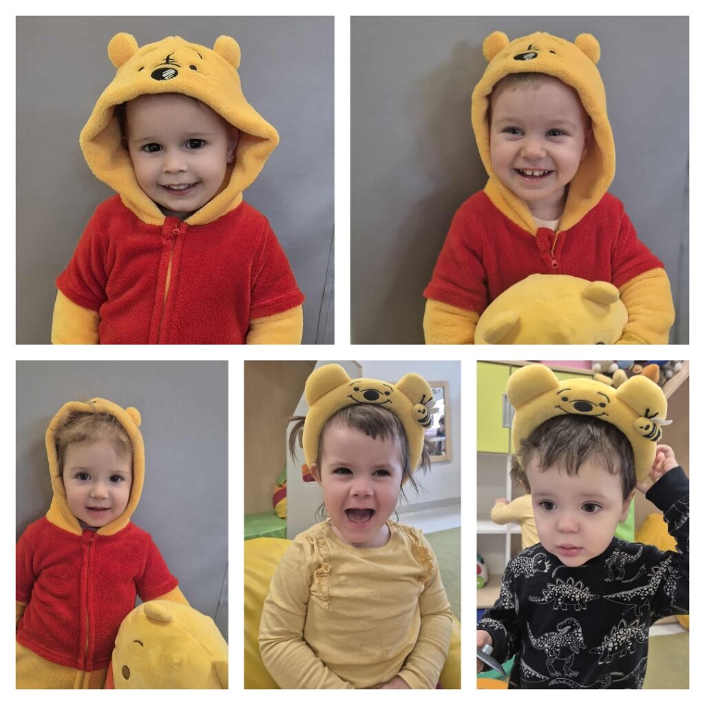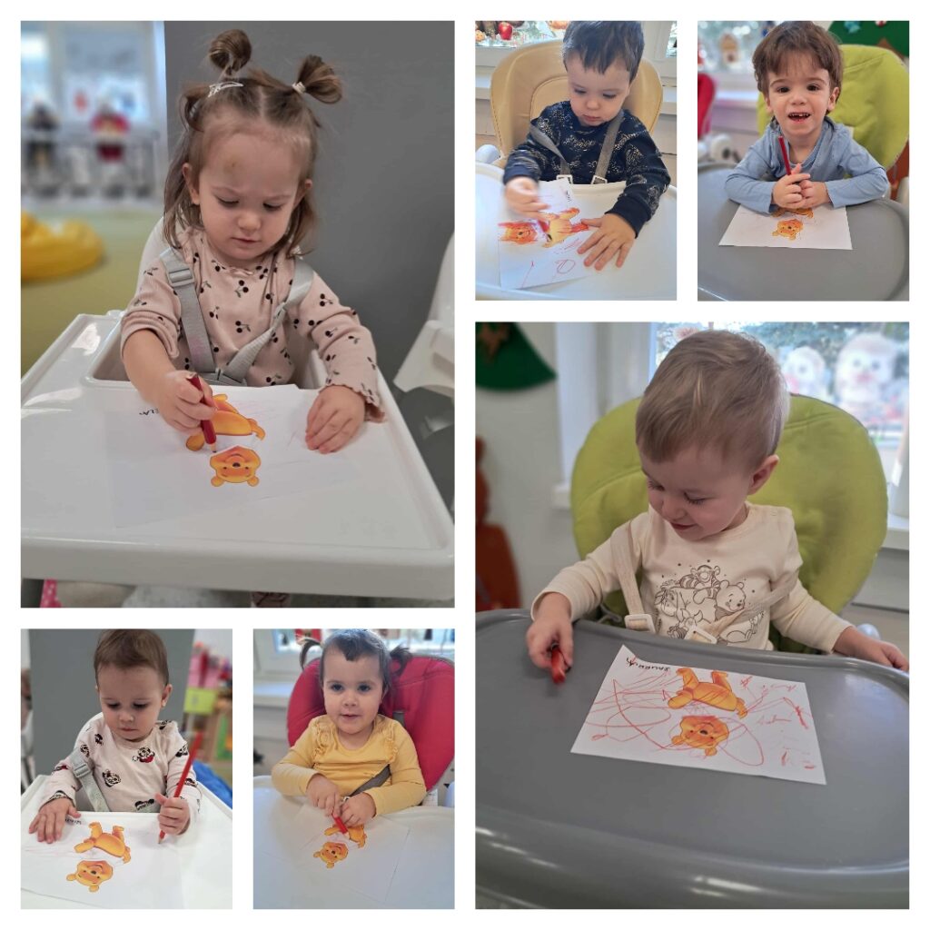 Wykonaliśmy pracę plastyczną przedstawiająca sympatycznego misia. Słuchaliśmy także piosenki „Pociąg do Stumilowego Lasu”.