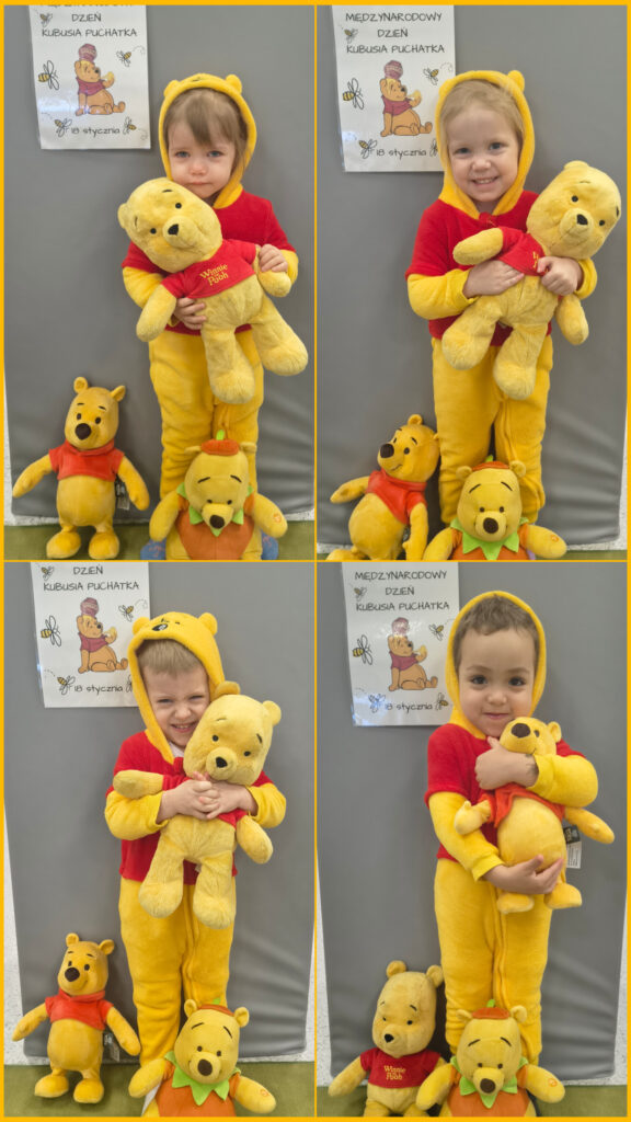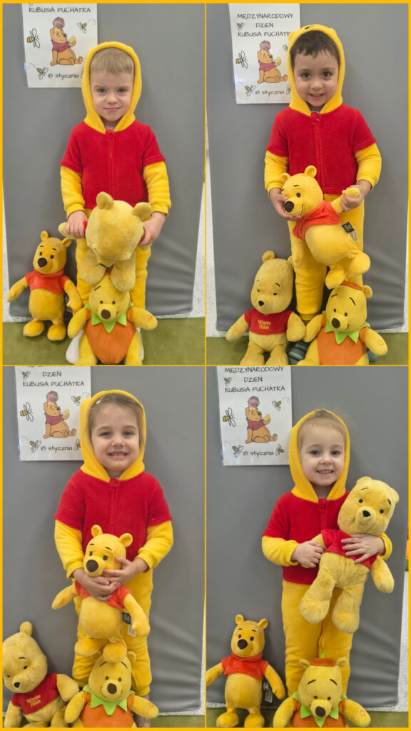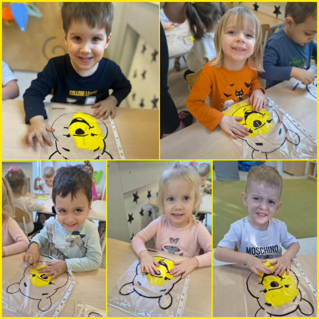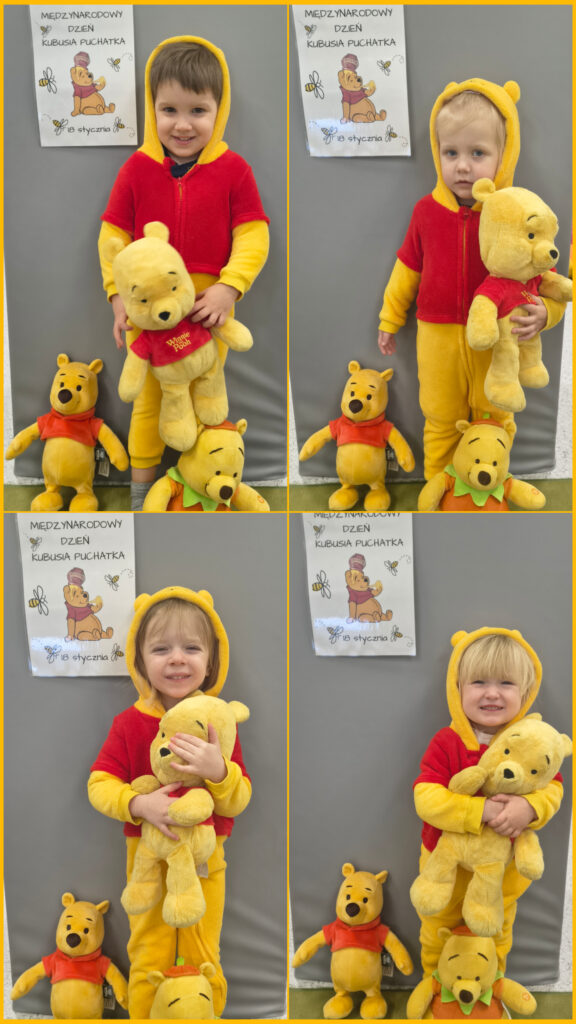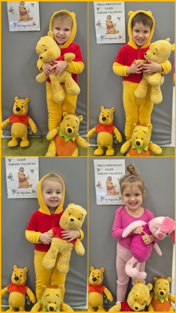 Kolejny tydzień stycznia dla Zajączków był okazją do rozwijania wyobraźni i integrowania się z grupą w czasie swobodnych zabaw. Zabawą polegającą na rzucaniu piłki do dzieci ciocie ćwiczyły z Zajączkami pamięć i refleks. Odbyły się zajęcia muzyczno – rytmiczne dotyczące zabaw zimowych. Dzieci i ciocie ilustrowały ruchem tekst grupowej zabawy o bałwanku oraz udały się na jazdę w kuligu na sankach z odgłosami wydawanymi przez dzwoneczki u uzdy koników. Chodziliśmy po śladach starając się utrzymać równowagę. Masowaliśmy także rączki piłeczkami z wypustkami. Swoje trzecie urodzinki świętował z Zajączkami Ludwik, któremu ciocie życzą dużo zdrówka, uśmiechu na buzi i słoneczka na co dzień. W DNIU KUBUSIA PUCHATKA dzieci wykonały pracę plastyczną – Kubusia Puchatka i postarały się swoim ubiorem zaakcentować jego święto. Przez cały czas budowaliśmy radosny nastrój zaufania, szacunku i akceptacji.