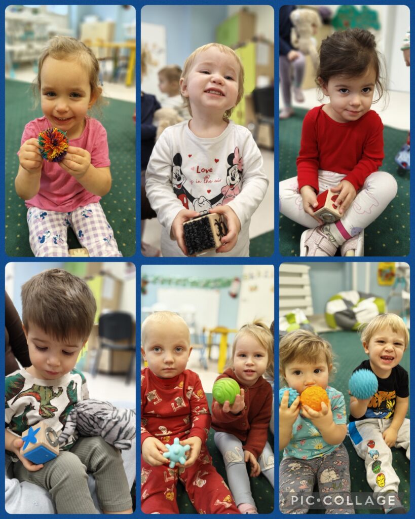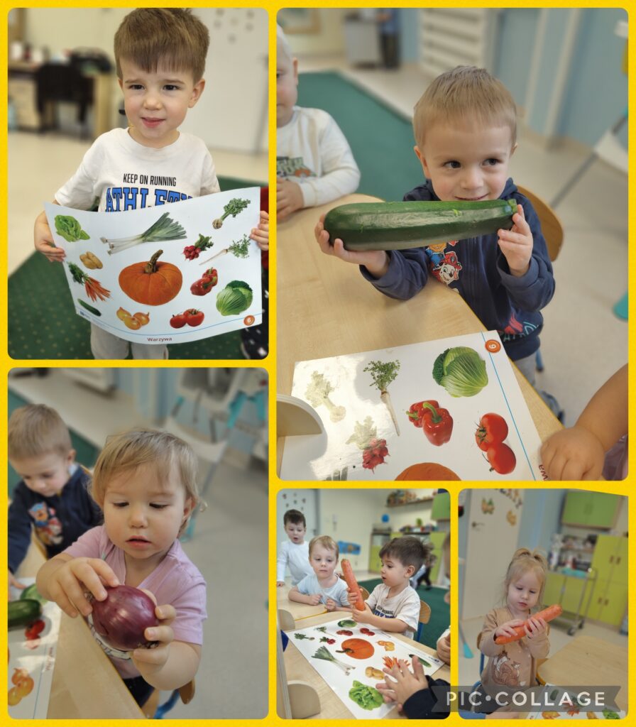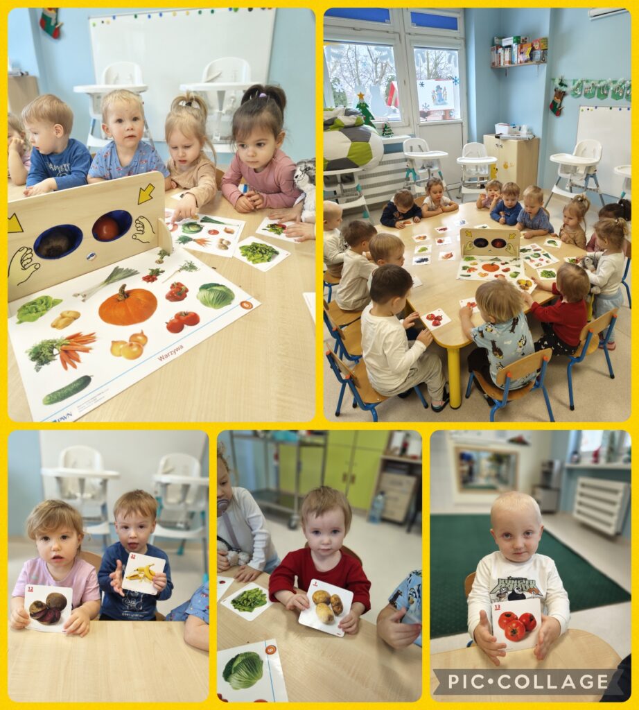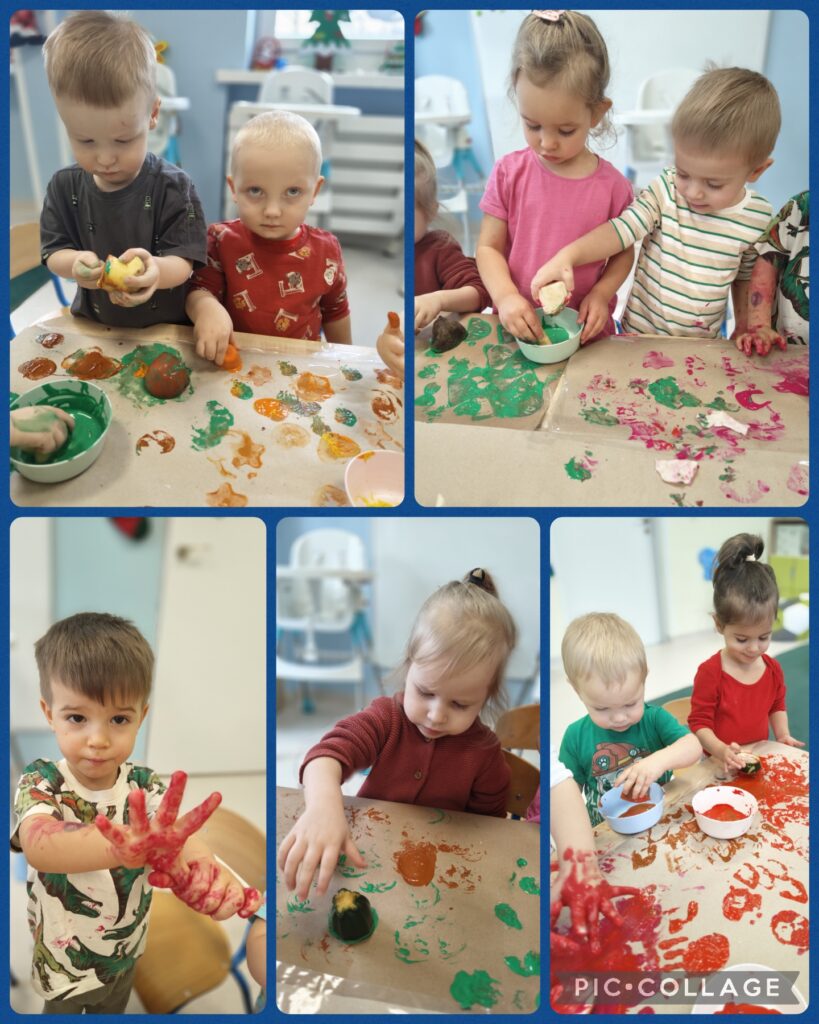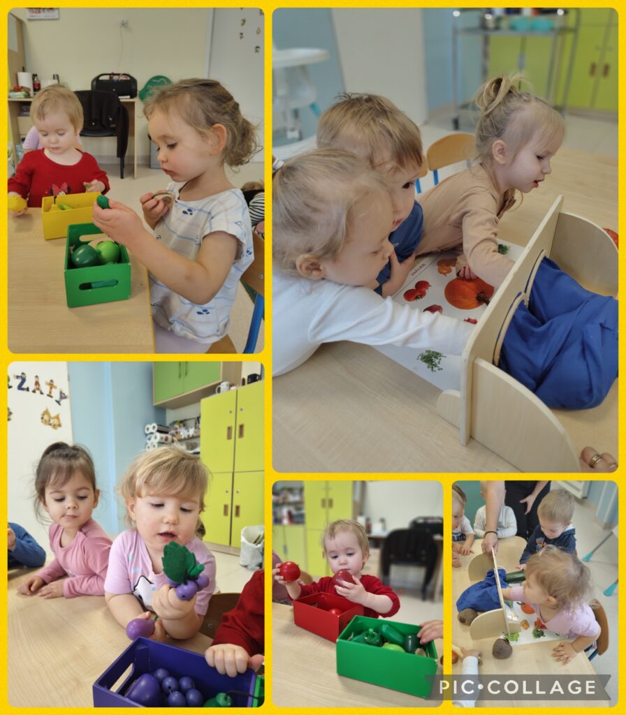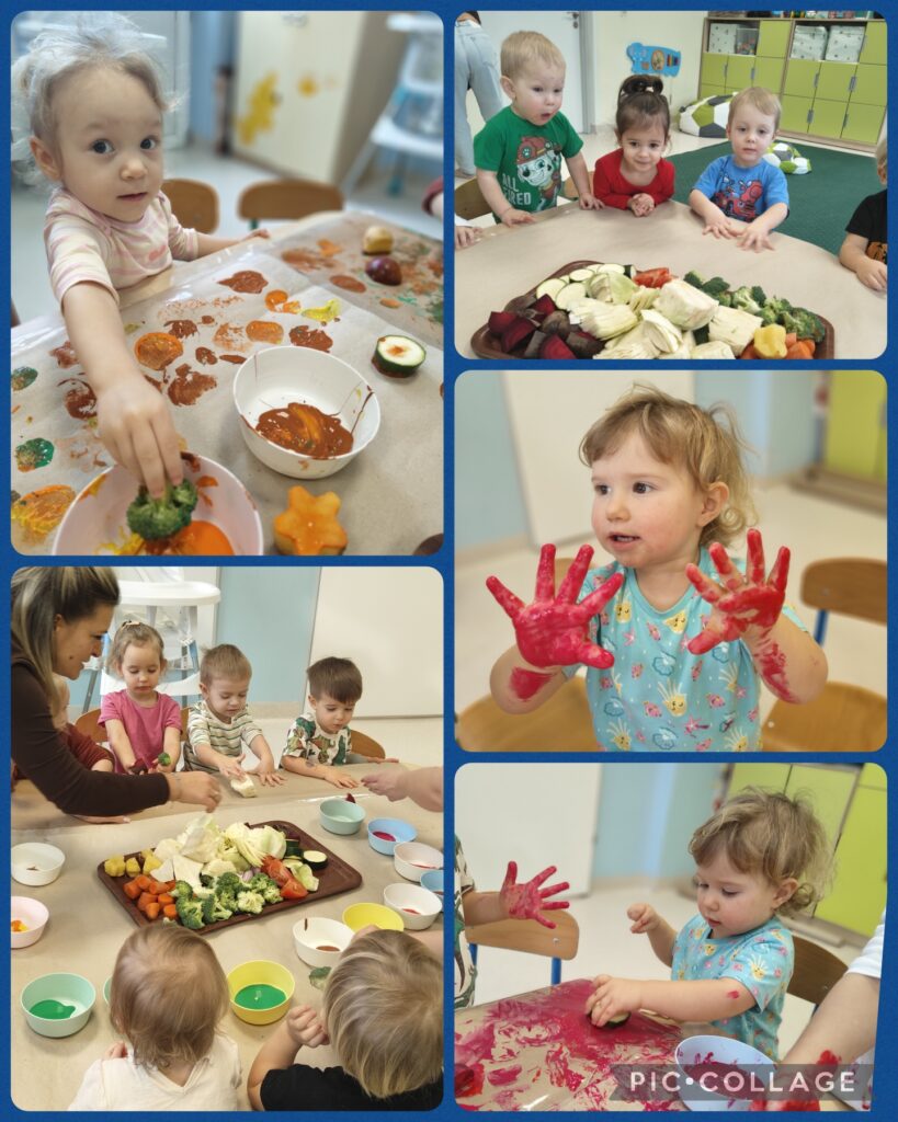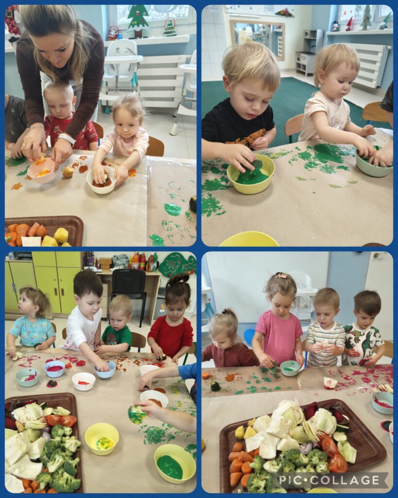 Na zajęciach sensoplastycznych poznawaliśmy kolory i kształty warzyw wykonując piękne pieczątki na papierze.