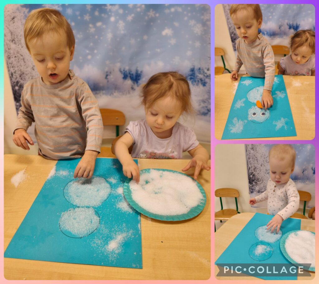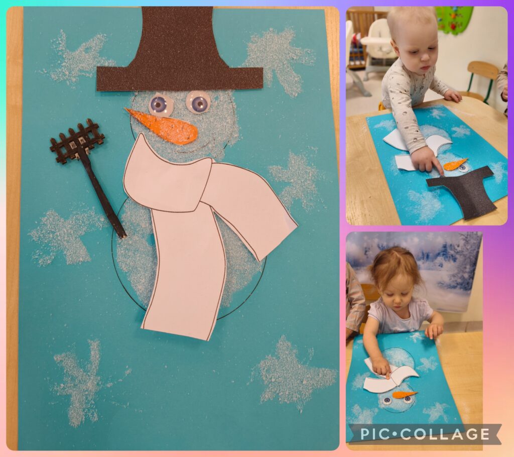 Z pomocą opiekunek lepiły bałwanka oraz wykonały tematyczną pracę plastyczną, ćwicząc sprawność manualną swoich rączek.