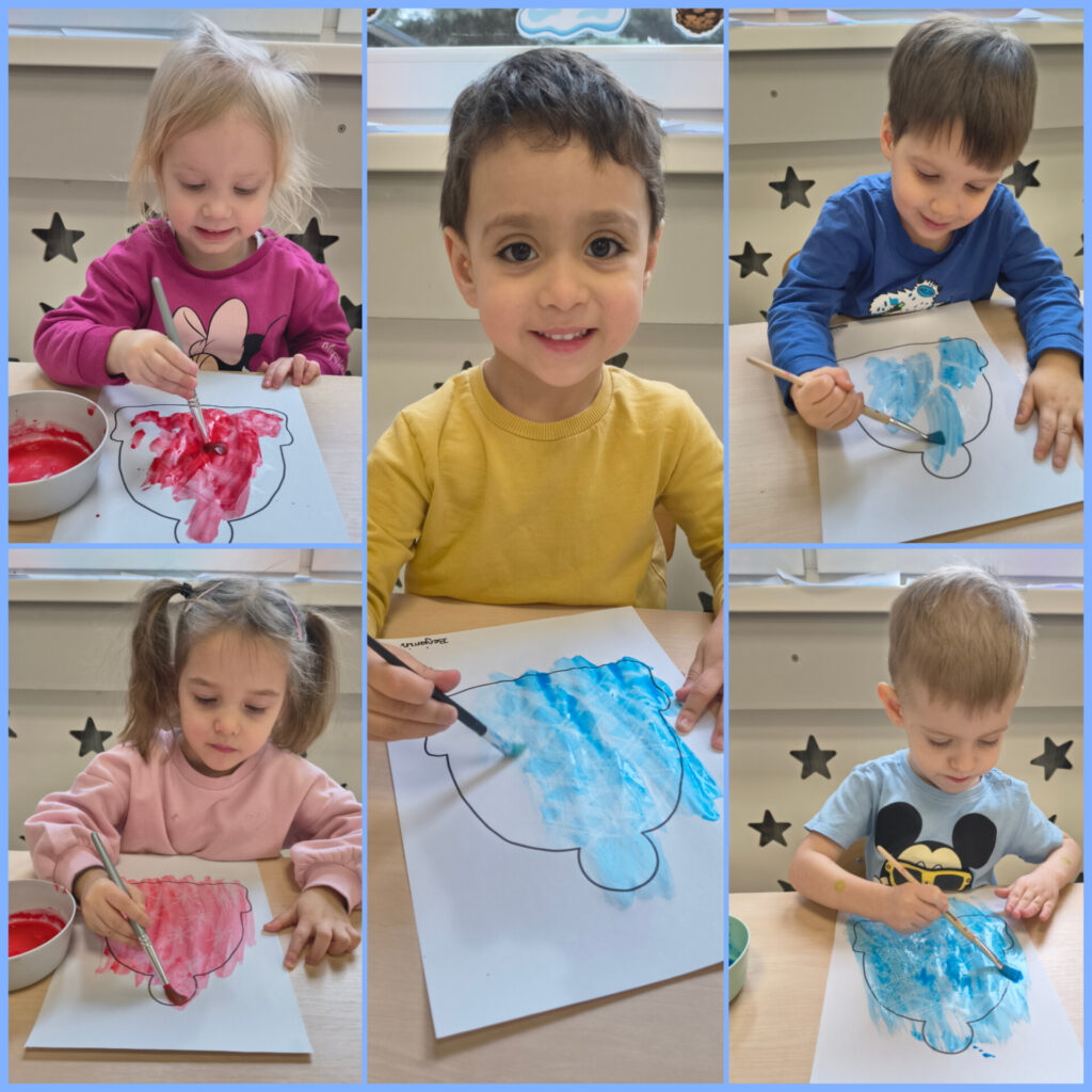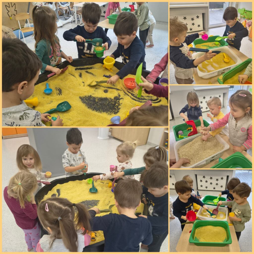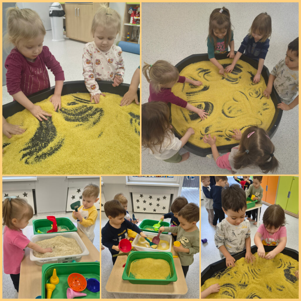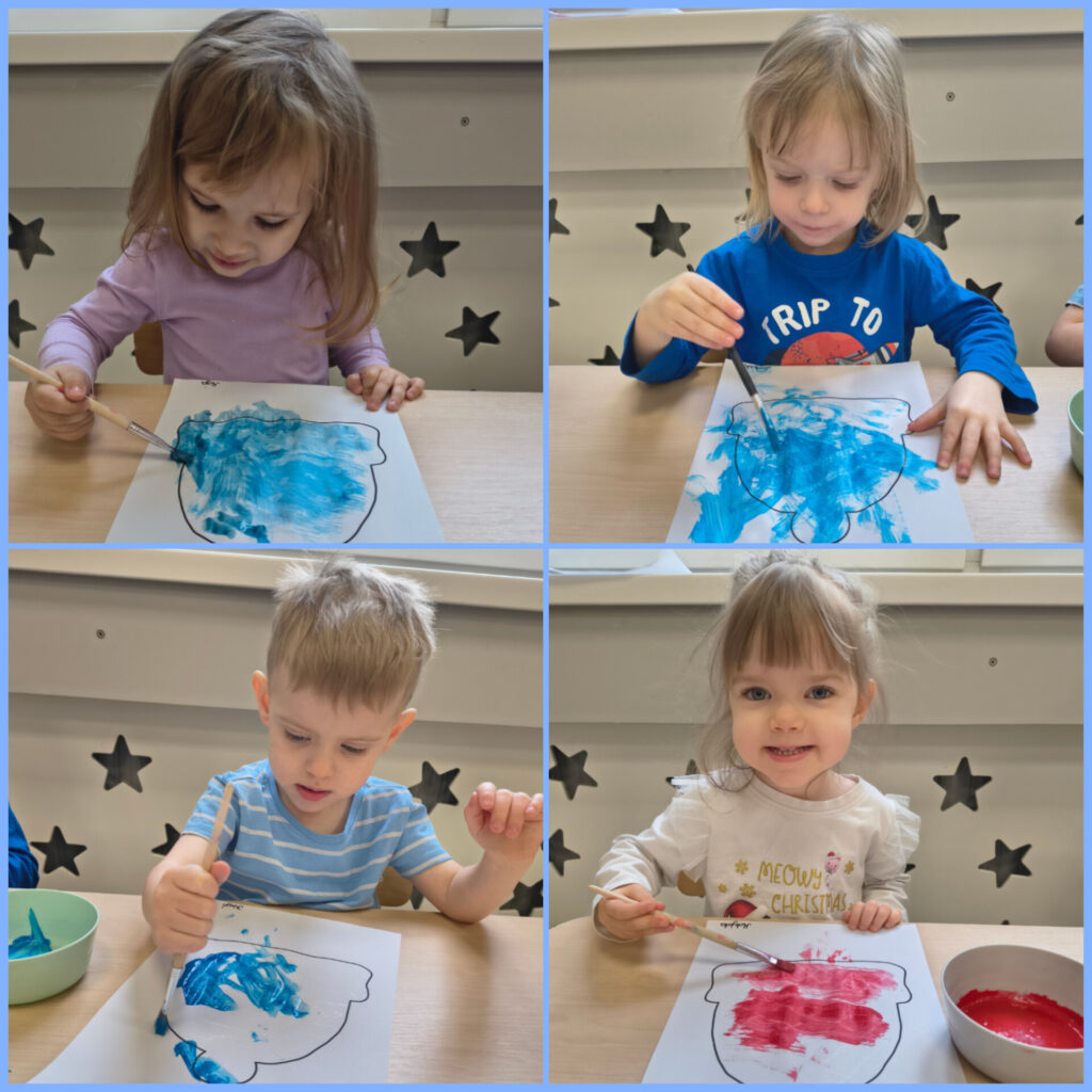 Pierwszy tydzień lutego grupa Zajączków rozpoczęła od utrwalania zjawisk atmosferycznych charakterystycznych dla zimy. W DNIU NIEDŹWIEDZIA bawiliśmy się do piosenki „Stary niedźwiedź mocno śpi” naśladując jego nawyki podczas snu. Ubieraliśmy niedźwiadka na zimowy spacerek w czapki, szaliki i rękawiczki. Wykonaliśmy pracę plastyczną – zimowa czapka – ćwicząc prawidłowe posługiwanie się przyborami plastycznymi. Bawiąc się kaszą jaglaną, uwalniając naturalną ekspresję Zajączki rozwijały radość i samodzielność. Dzieci przesypywały kaszę przez sito, przekładały do miseczek, szukały skarbów schowanych i zasypanych przez kaszę. Odbyły się również próby rysowania paluszkami indywidualnych grafik jaglanych. Swoje trzecie urodzinki obchodziła Maja, której ciocie i Zajączki życzą dużo zdrówka, uśmiechu i słoneczka w każdy dzień.