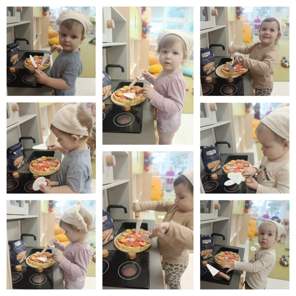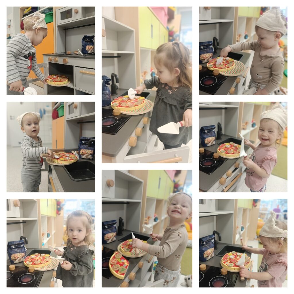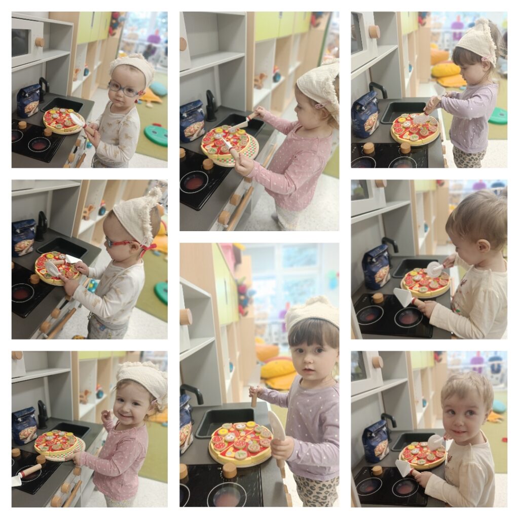 Tworzyliśmy wspólnie pizzę przez dobór wyciętych elementów. Bawiliśmy się również używają maty edukacyjnej przedstawiającej pizzę.