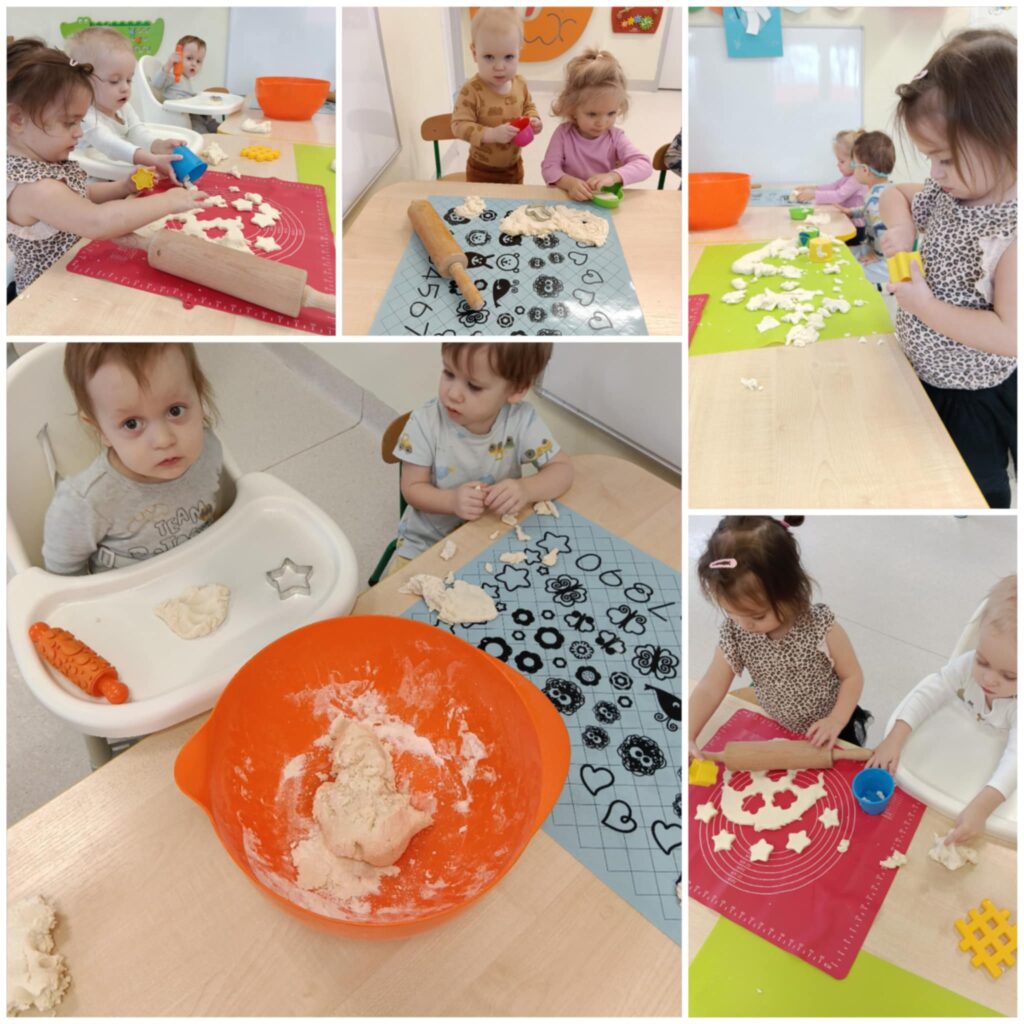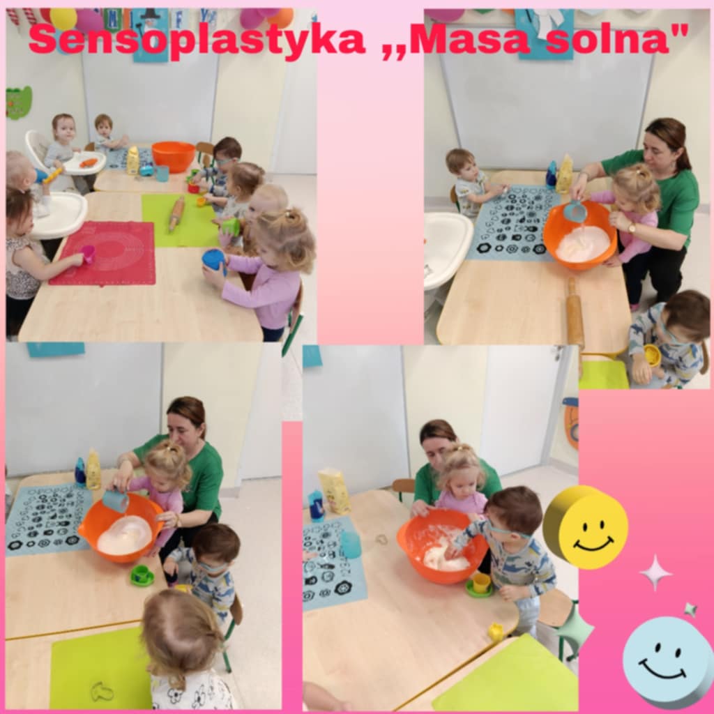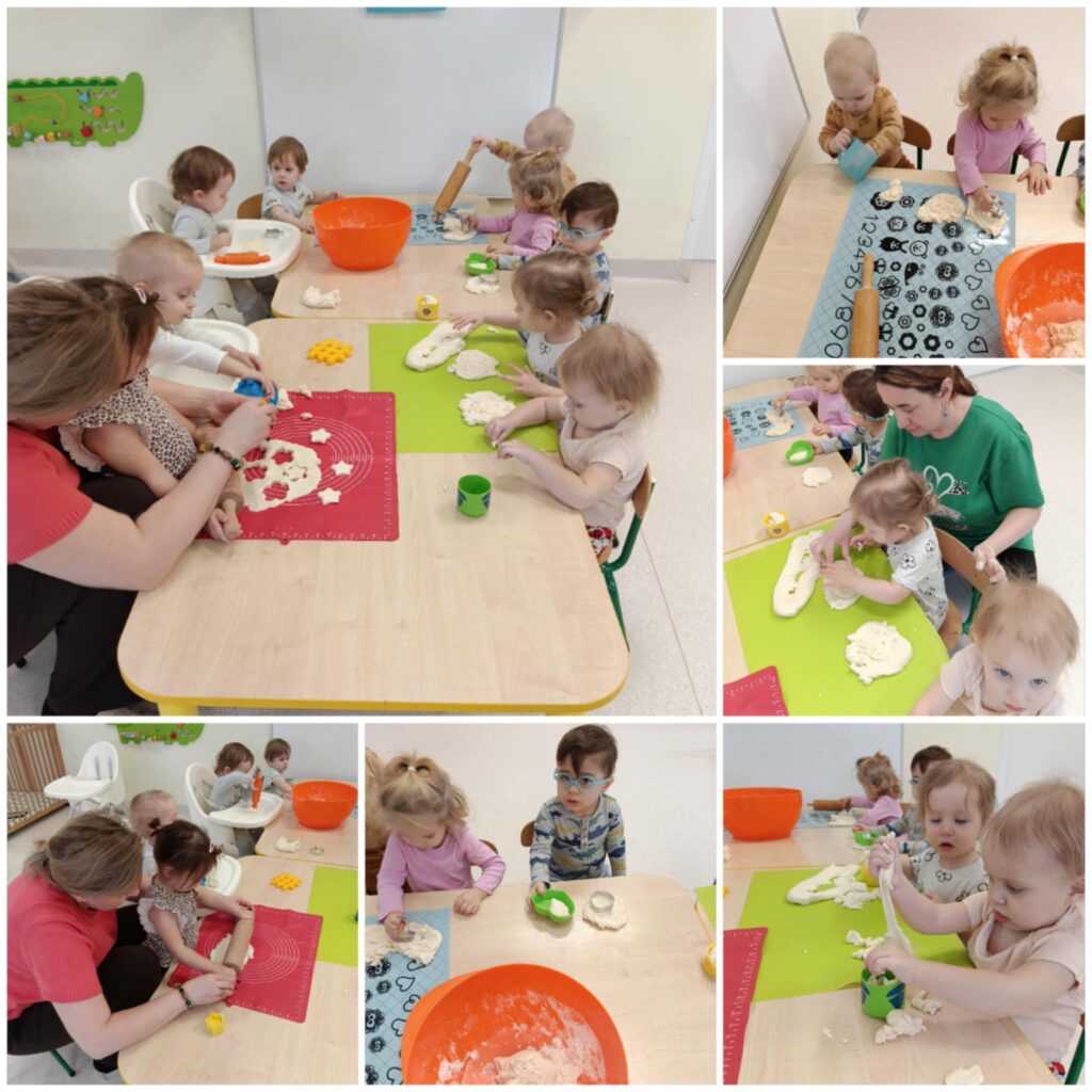 Podczas zajęć sensoplastycznych dzieci wspólnie z opiekunkami przygotowywały masę solną, z której następnie, przy użyciu różnorodnych foremek, tworzyły ciekawe kształty i wzory. Maluszki ćwiczyły sprawność manualną dłoni i palców oraz koordynację wzrokowo – ruchową.