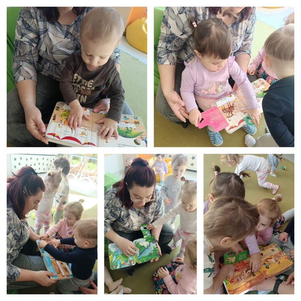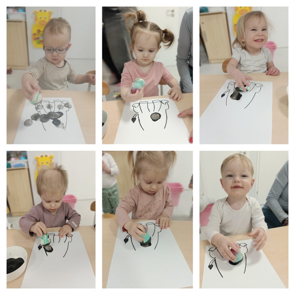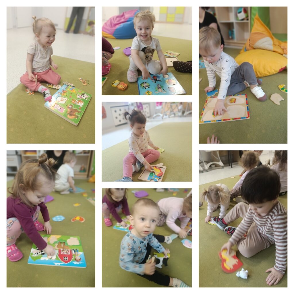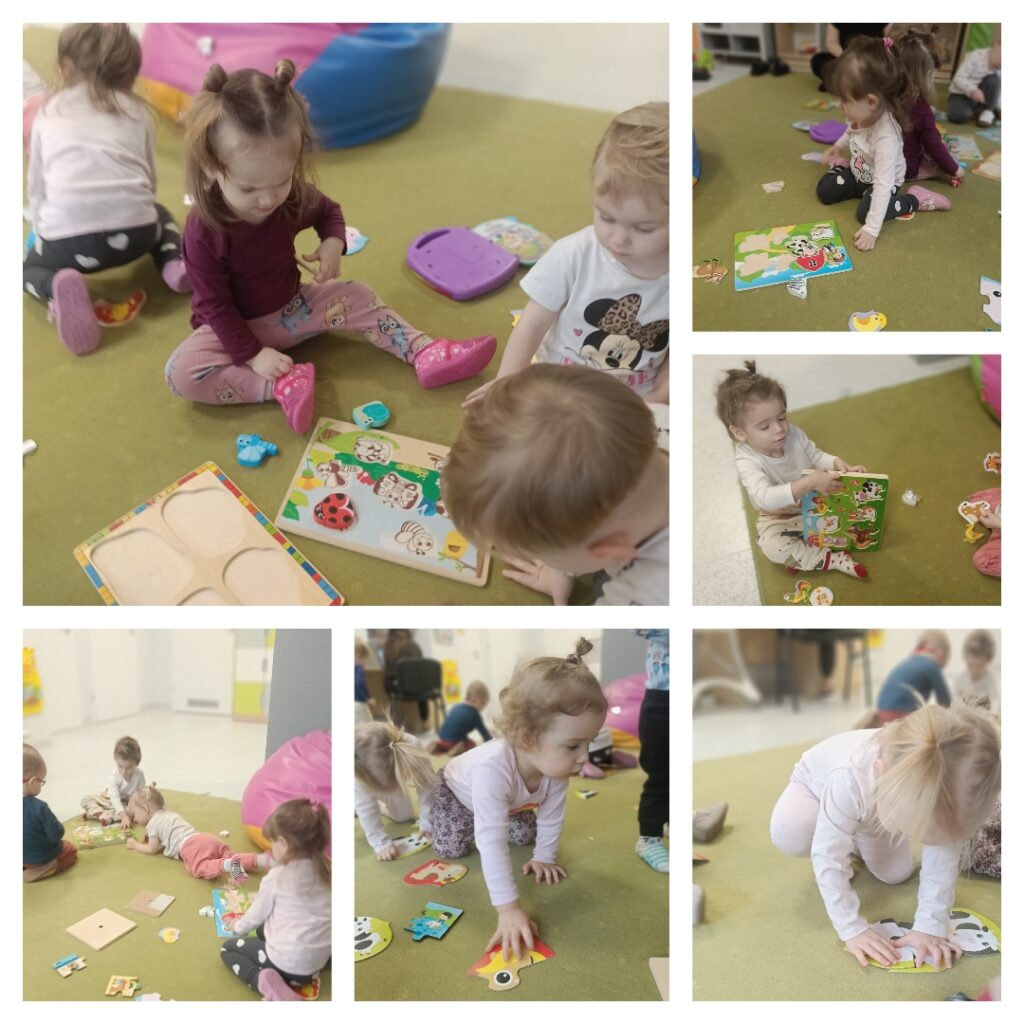Kolejny tydzień żłobkowej przygody Jeżyki rozpoczęły piosenką na powitanie oraz poranną gimnastyką. Poznawaliśmy zwierzęta zagrodowe: krówkę, świnkę, konika. Omówiliśmy ich kolory oraz poznaliśmy miejsca, w których mieszkają. We wtorek układaliśmy zwierzątka na tablicy magnetycznej. Dopasowywaliśmy także elementy w układankach i sorterach.