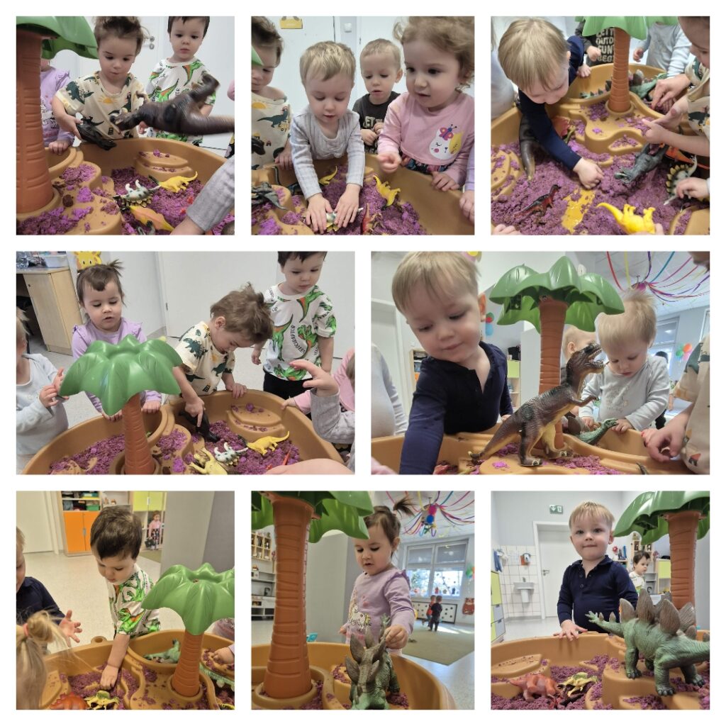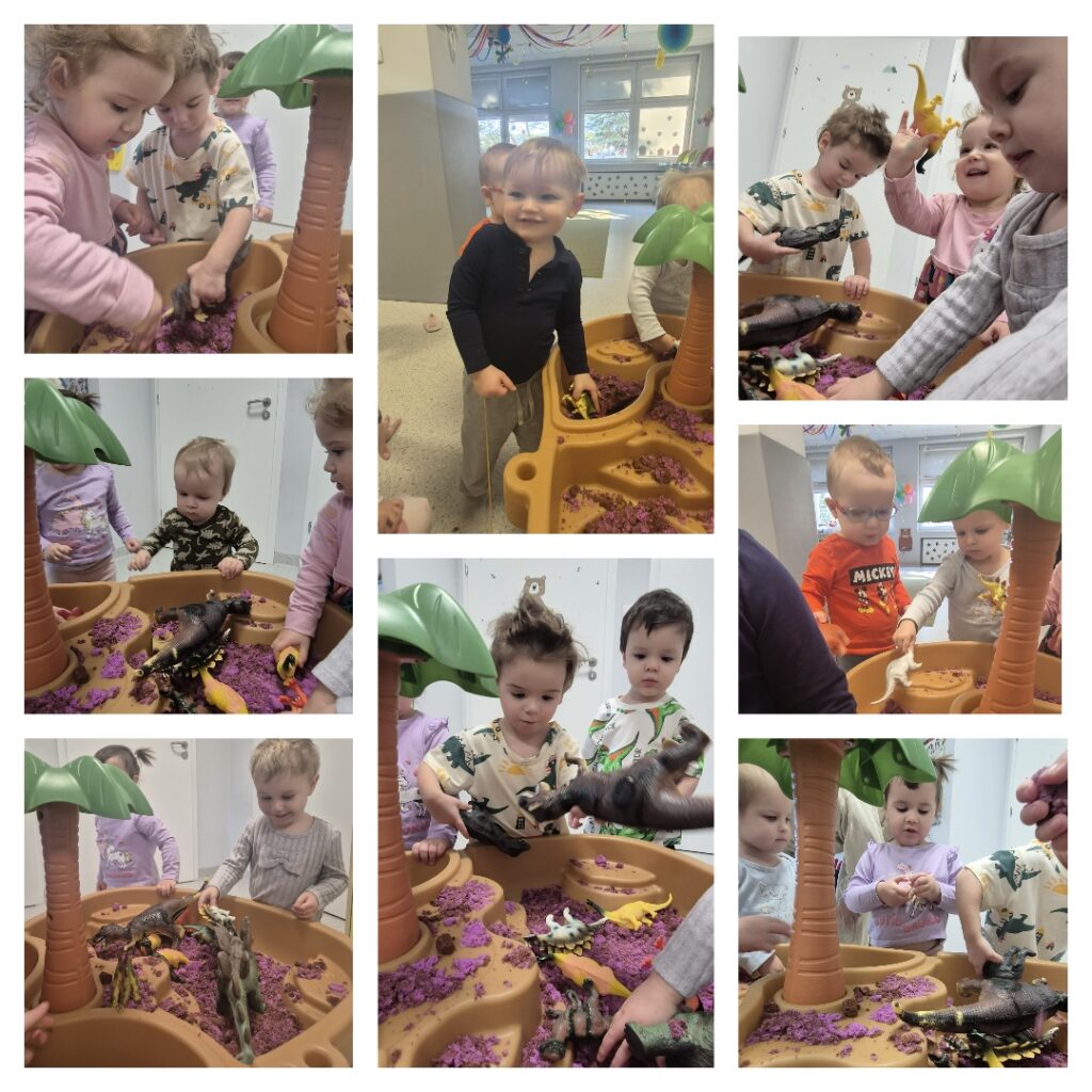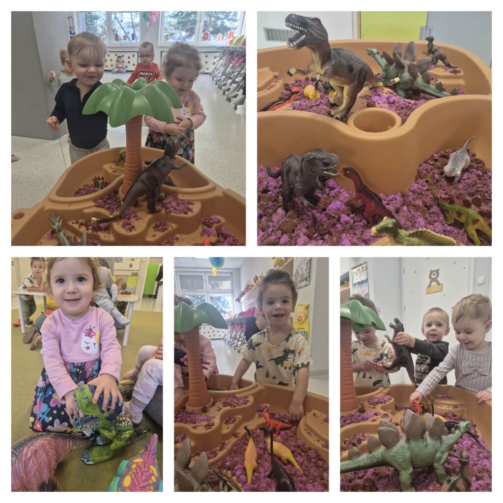 Odbyły się zajęcia sensoryczne podczas których bawiliśmy się piaskiem kinetycznym, w którym zakopywaliśmy figurki dinozaurów. Poznaliśmy także piosenkę,, Dinozaury”.