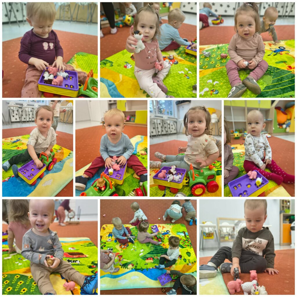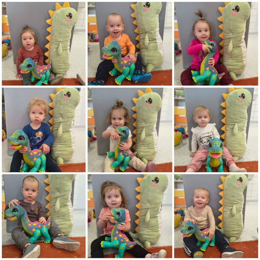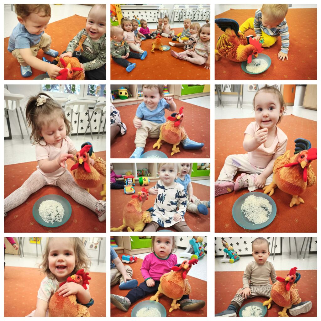 W tym tygodniu Niedźwiadki poznawały zwierzątka zagrodowe oraz miejsca, w których mieszkają. Bawiliśmy się farmą na kolorowym dywanie oraz karmiliśmy kurę. Ciocie przeczytały dzieciom wiersz pt. “W gospodarstwie” i wspólnie oglądaliśmy książeczki tematyczne. Uczyliśmy się naśladować dźwięki jakie wydają zwierzątka tj. kurka, krówka, baran, świnka, kaczka itd. Słuchaliśmy wspólnie nowych piosenek tj. “Dziadek fajną farmę miał…”, “Idą kaczuszki”, “Gdacze kura ko ko ko…”. W czwartek obchodziliśmy Dzień Dinozaura. Z tej okazji na zajęciach sensoplastycznych bawiliśmy się w wykopaliska, szukając zakopanych w piasku dinozaurów oraz robiliśmy doświadczenie pt. wulkan. Na zajęciach plastycznych Niedźwiadki wyklejały kuleczkami z bibuły swojego dinozaura. W piątek korzystając z ładnej pogody wybraliśmy się na spacer szukając pierwszych oznak wiosny. Przez cały tydzień towarzyszyły Nam wspólne zabawy tj. układanie klocków, oglądanie książeczek i zabawa autkami.
