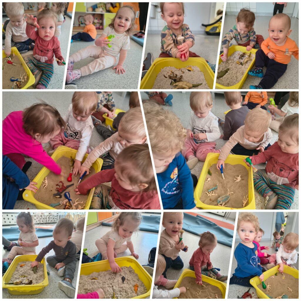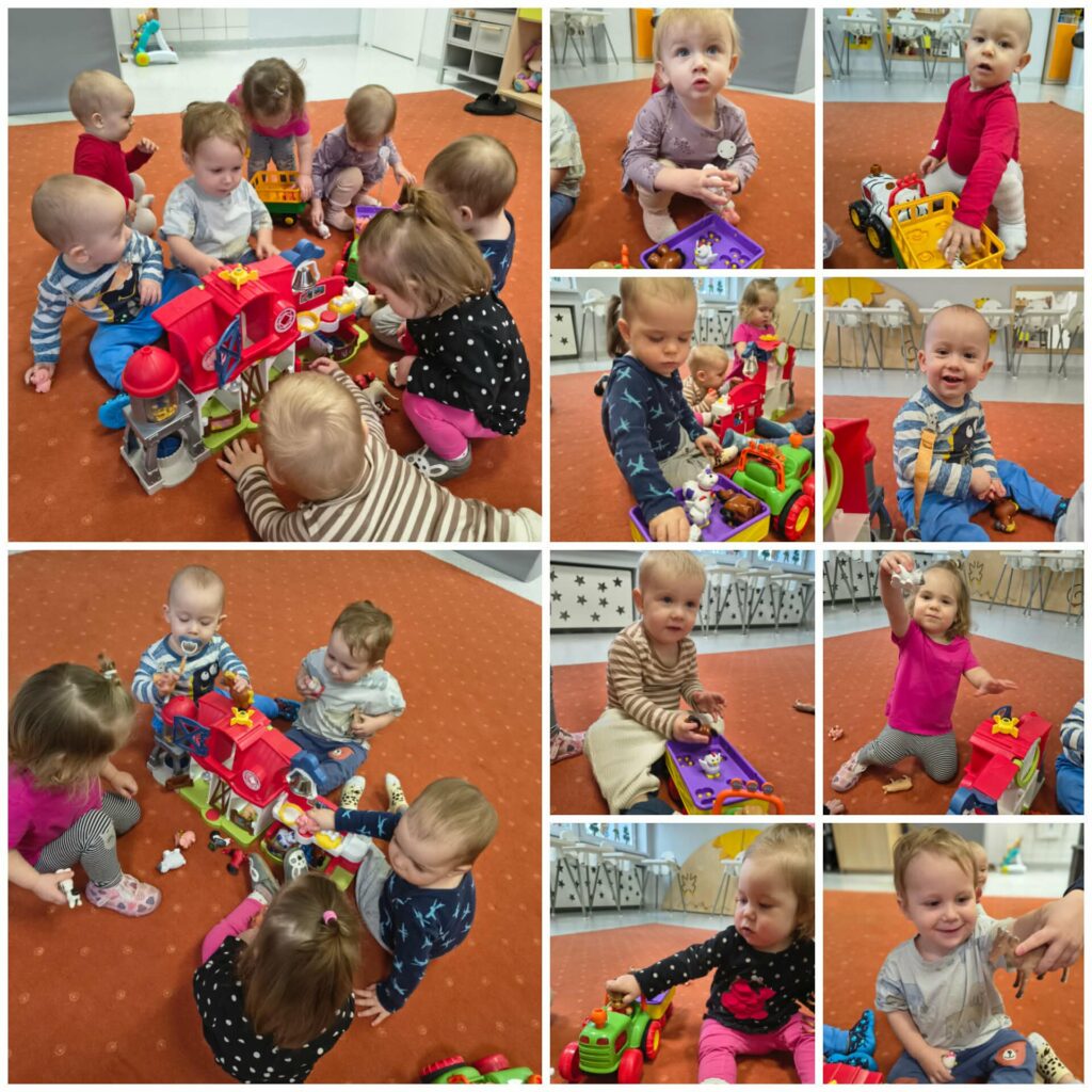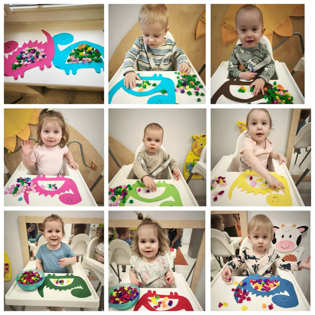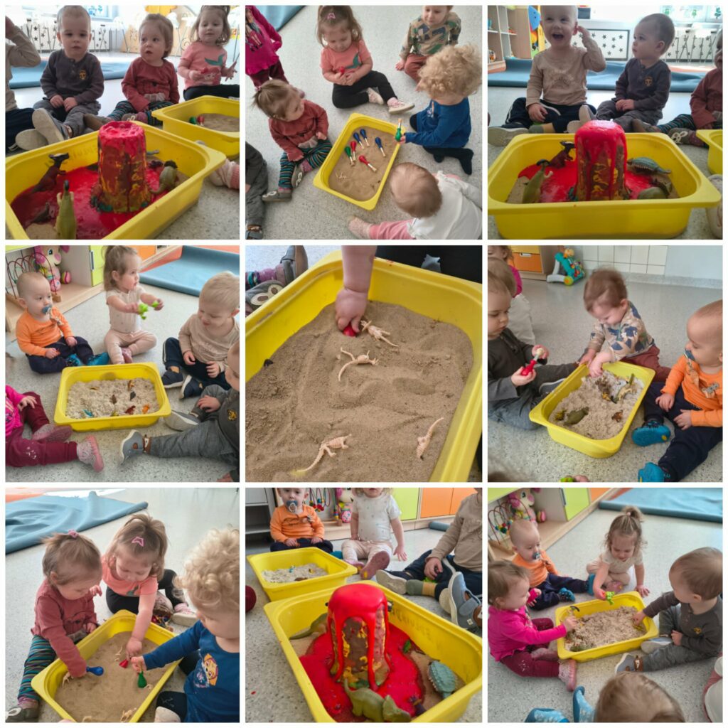 W tym tygodniu Niedźwiadki poznawały zwierzątka zagrodowe oraz miejsca, w których mieszkają. Bawiliśmy się farmą na kolorowym dywanie oraz karmiliśmy kurę. Ciocie przeczytały dzieciom wiersz pt. “W gospodarstwie” i wspólnie oglądaliśmy książeczki tematyczne. Uczyliśmy się naśladować dźwięki jakie wydają zwierzątka tj. kurka, krówka, baran, świnka, kaczka itd. Słuchaliśmy wspólnie nowych piosenek tj. “Dziadek fajną farmę miał…”, “Idą kaczuszki”, “Gdacze kura ko ko ko…”. W czwartek obchodziliśmy Dzień Dinozaura. Z tej okazji na zajęciach sensoplastycznych bawiliśmy się w wykopaliska, szukając zakopanych w piasku dinozaurów oraz robiliśmy doświadczenie pt. wulkan. Na zajęciach plastycznych Niedźwiadki wyklejały kuleczkami z bibuły swojego dinozaura. W piątek korzystając z ładnej pogody wybraliśmy się na spacer szukając pierwszych oznak wiosny. Przez cały tydzień towarzyszyły Nam wspólne zabawy tj. układanie klocków, oglądanie książeczek i zabawa autkami.