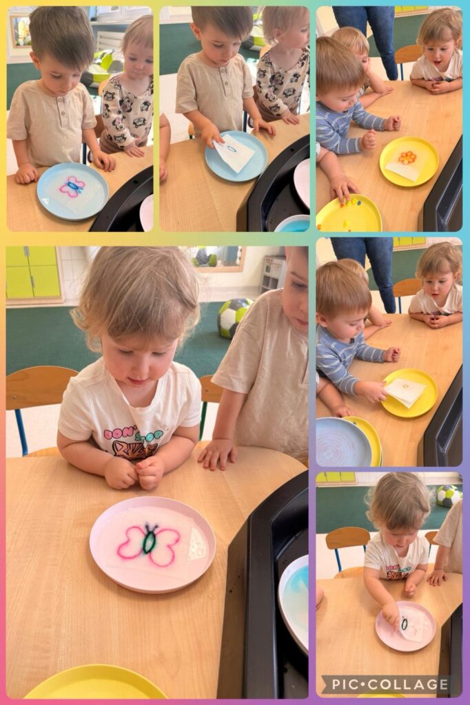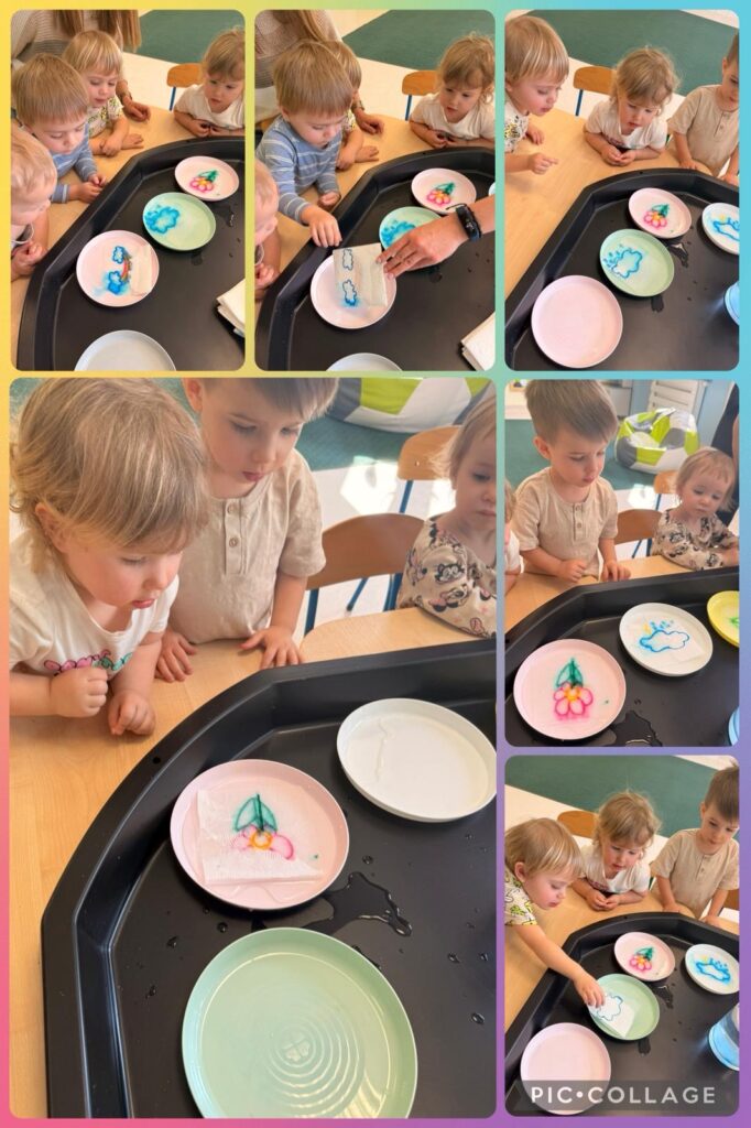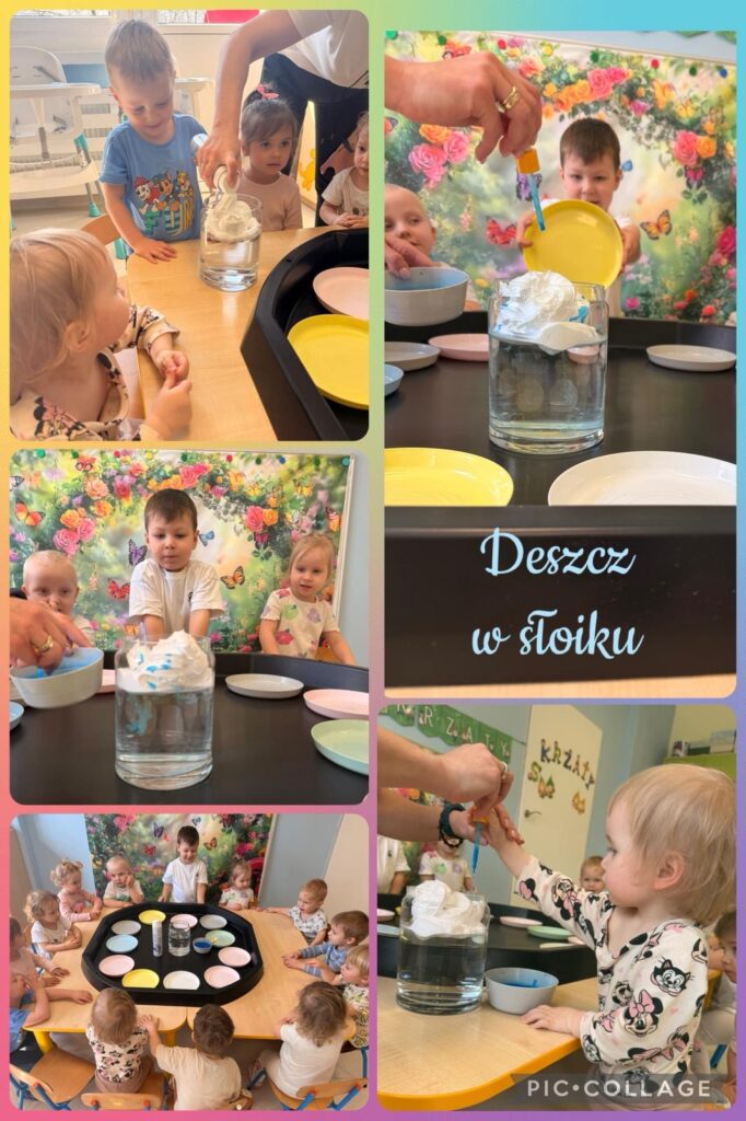 Na zajęciach sensoplastycznych dzieci wykonały eksperyment „deszcz w słoiku”, który wzbudził dużo ciekawości i radości.