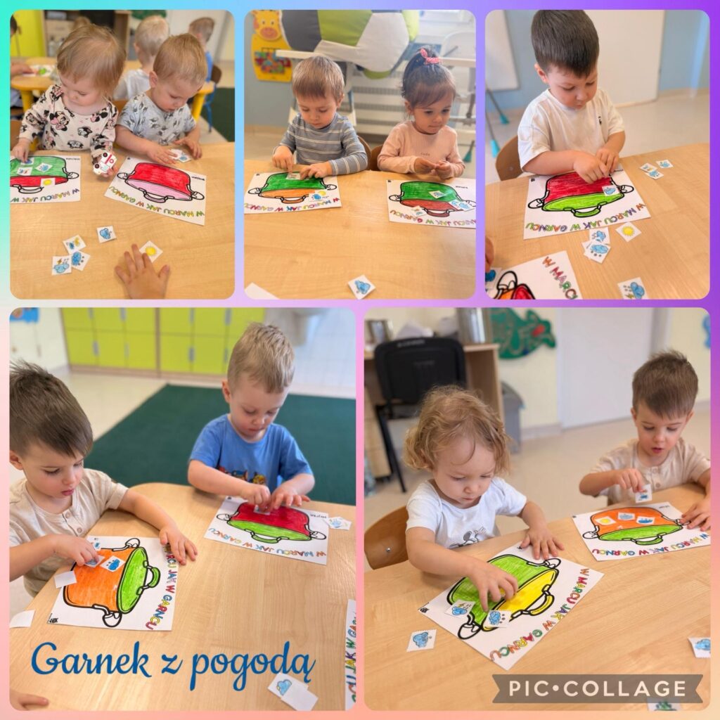 Podczas zajęć plastycznych wykonaliśmy „garnek z pogodą”, dzięki któremu dzieci utrwalały wiedzę o różnych zjawiskach atmosferycznych. Wspólnie przedstawialiśmy ruchem ciała pogodę – padający deszcz, wiejący wiatr i świecące słońce. Ćwiczyliśmy również oddech dmuchając w piórka, a podczas spacerów obserwowaliśmy wiosenną pogodę.