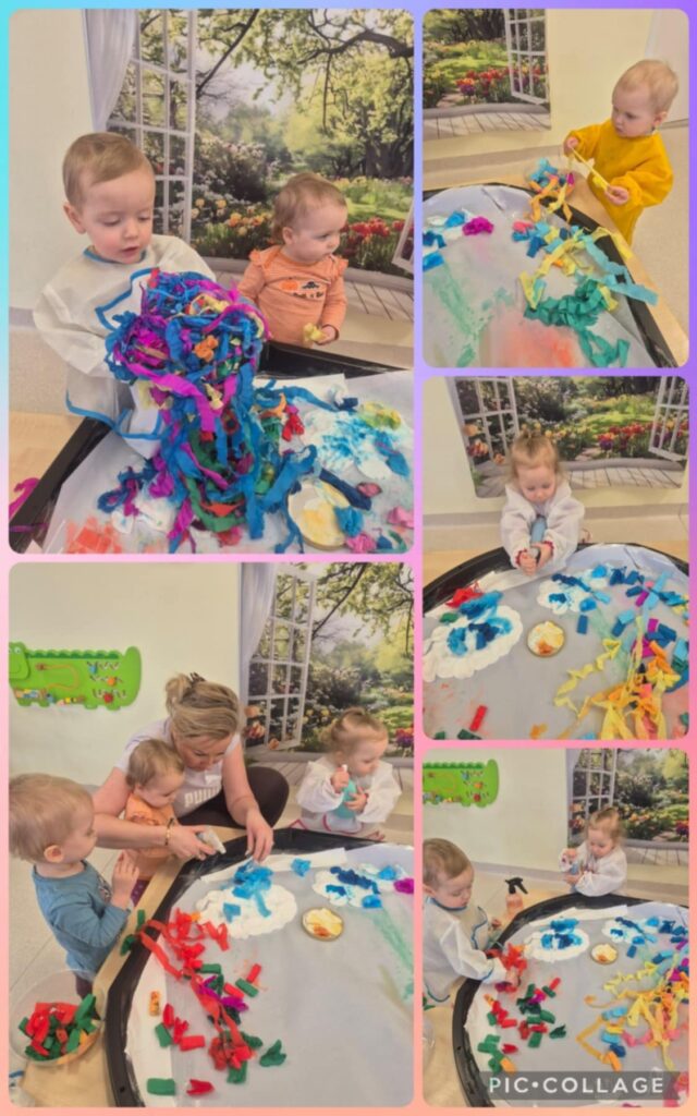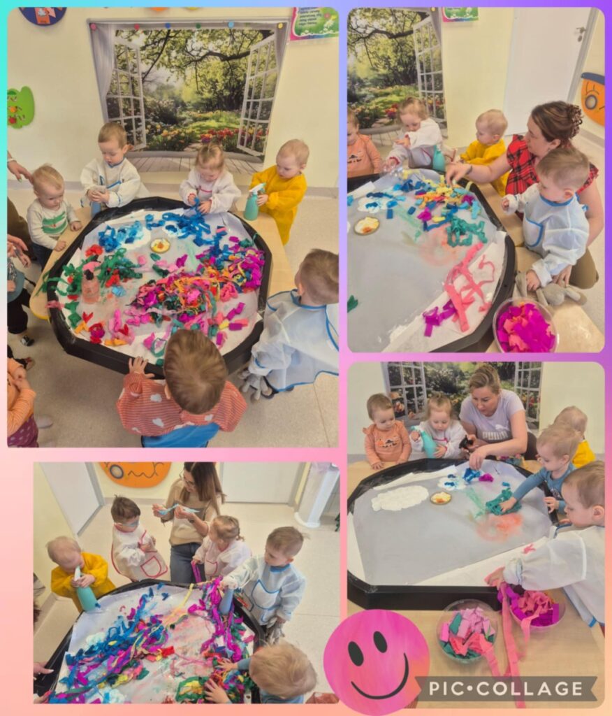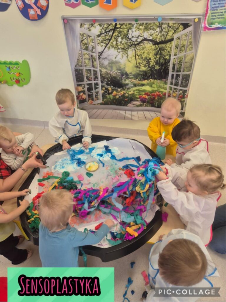 Na zajęciach sensoplastycznych tworzyliśmy różne ciekawe wzory układając kolorową bibułę na zmoczonych kartkach papieru. Podczas zajęć dzieci rozwijały koordynację wzrokowo -ruchową. Zabawa ta dostarczyła dużo pozytywnych wrażeń.