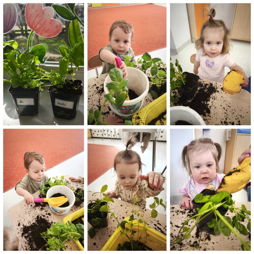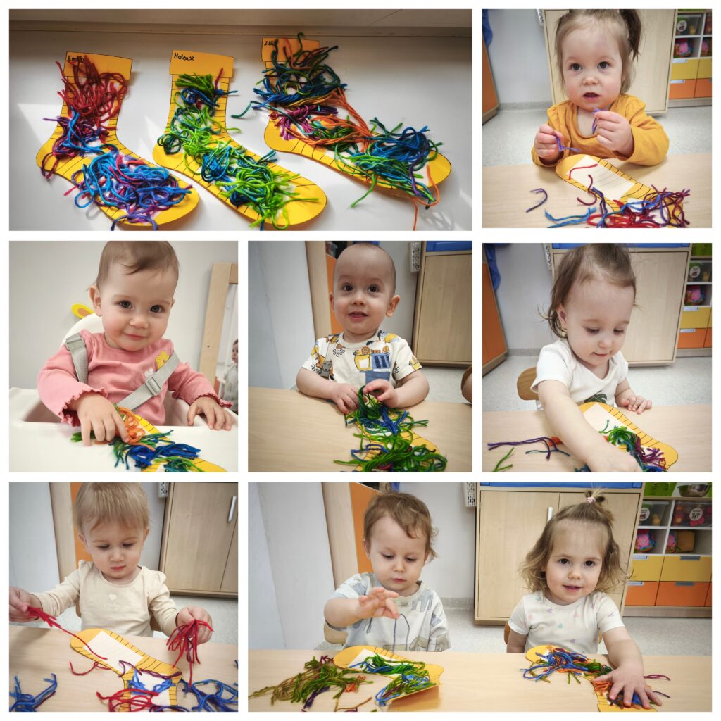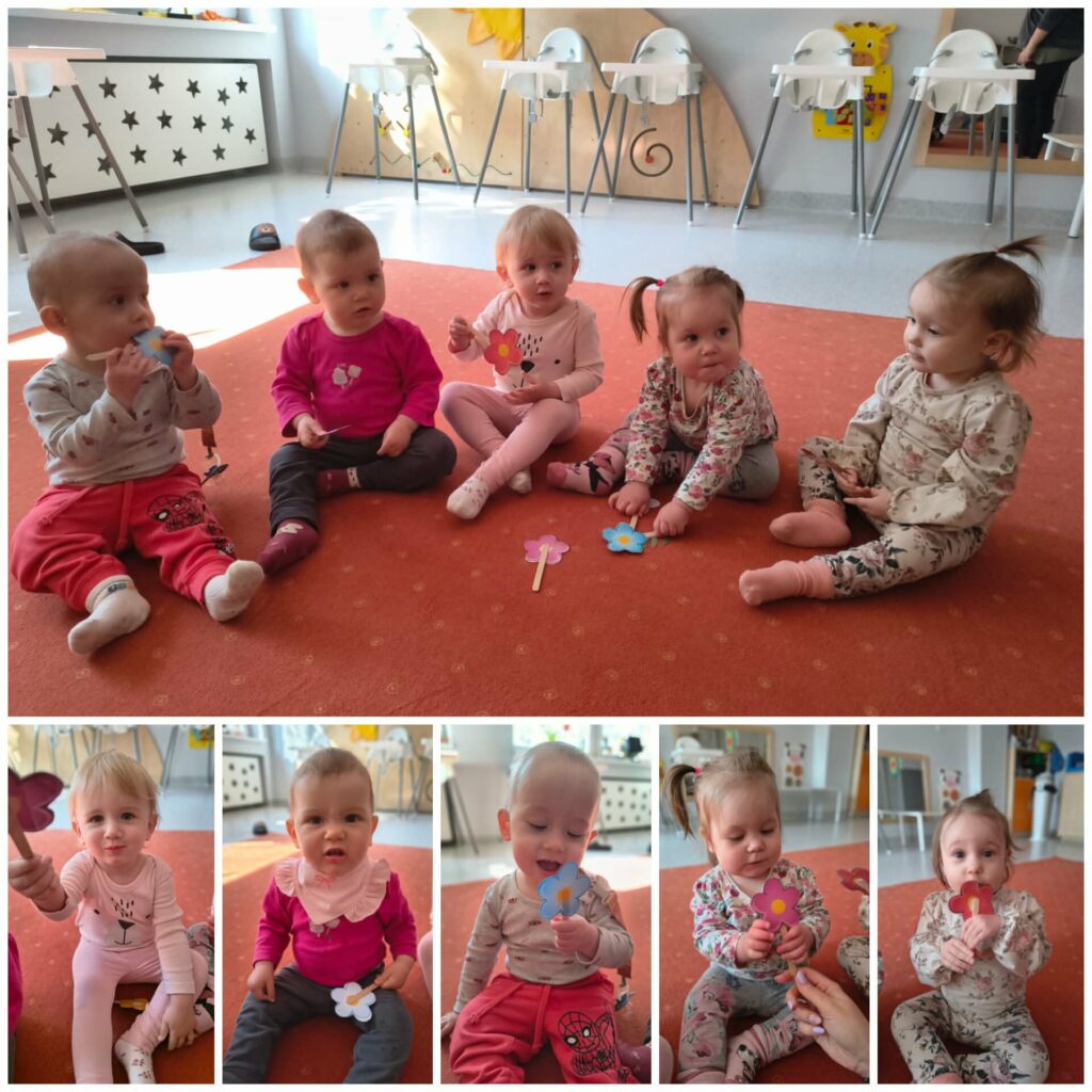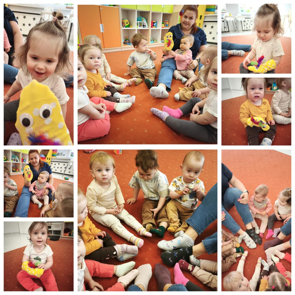 Ciocie przedstawiły wiersz „Idzie wiosna”. Podczas porannej gimnastyki dzieci ćwiczyły motorykę dużą. Udaliśmy się na spacer poszukując oznak wiosny. Bawiliśmy się w basenie z kulkami. Przy odgłosach pszczół próbowaliśmy naśladować odgłosy brzęczenia oraz żabki. Ćwiczyliśmy oddech wąchając kwiatki. Poznawaliśmy nowe piosenki „Była sobie żabka mała”, „Kle kle boćku”. Na zajęciach sensoplastycznych dzieci sadziły do doniczek zioła. W piątek obchodziliśmy pierwszy Dzień Wiosny oraz Dzień Kolorowej Skarpetki. Z tej okazji Ciocie wraz z dziećmi uczciły to święto zakładając dwie kolorowe skarpetki. Bawiliśmy się pacynką skarpetkową, która opowiadała nam o znikającej skarpetce. Wykonaliśmy pracę plastyczną: kolorowe skarpetki, wyklejając kolorową włóczką zarys skarpetki.