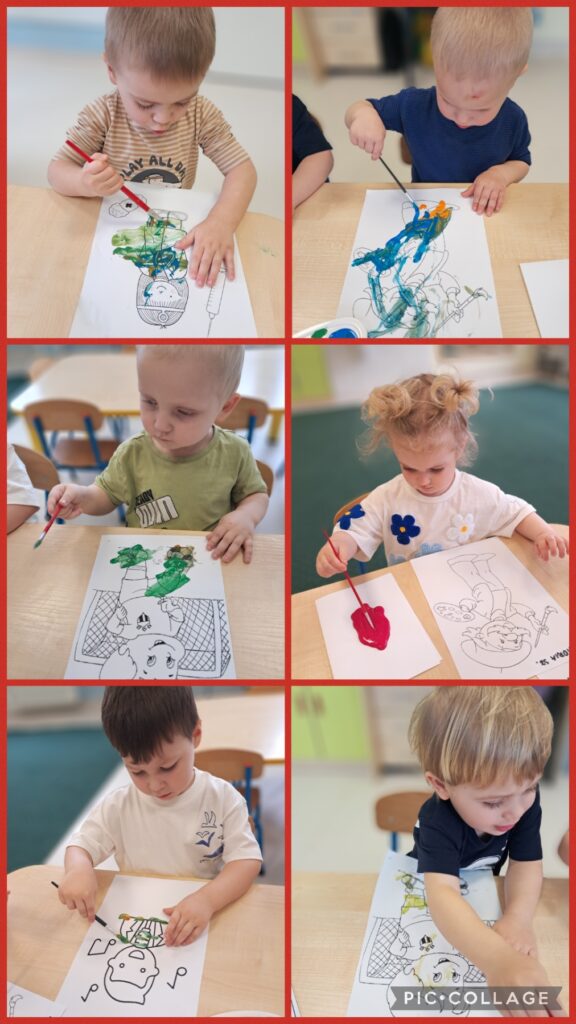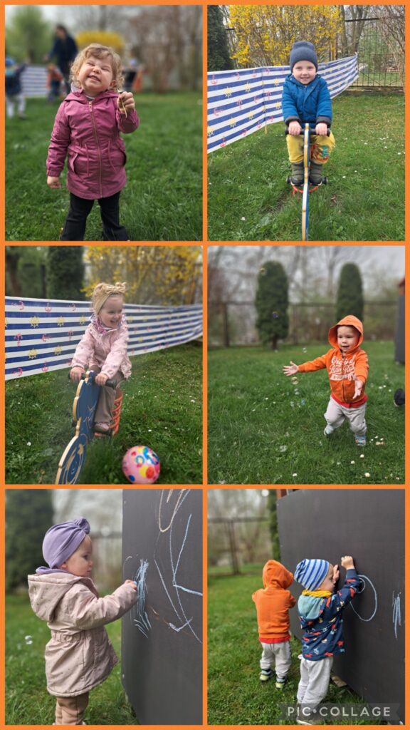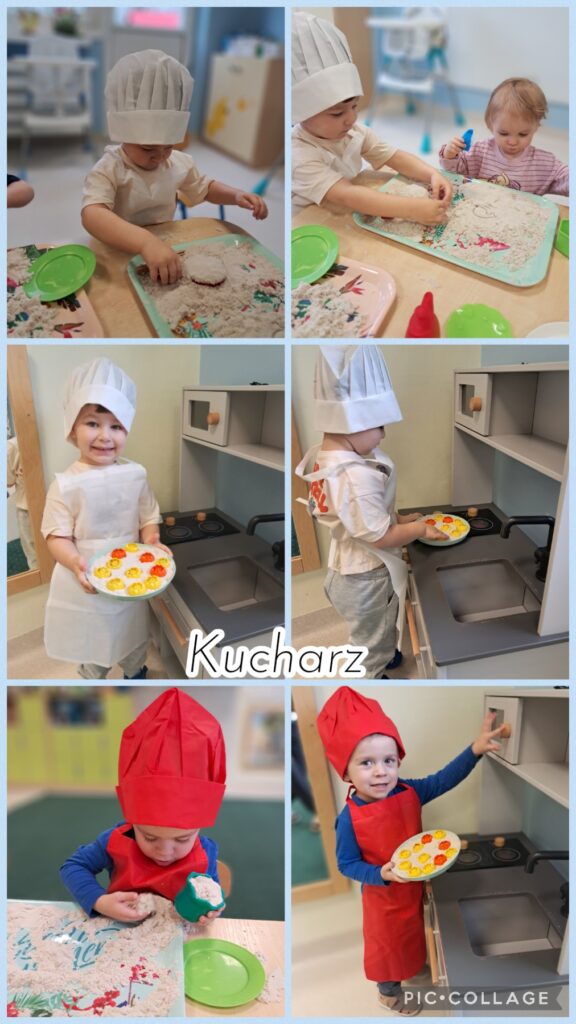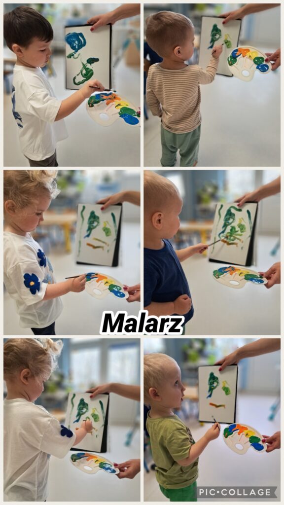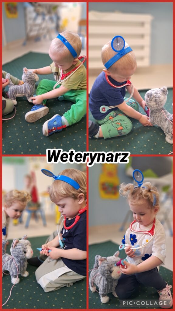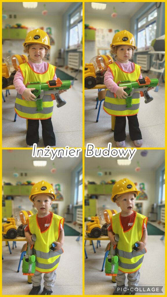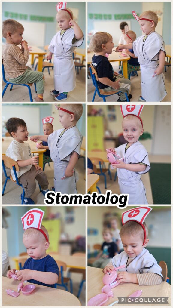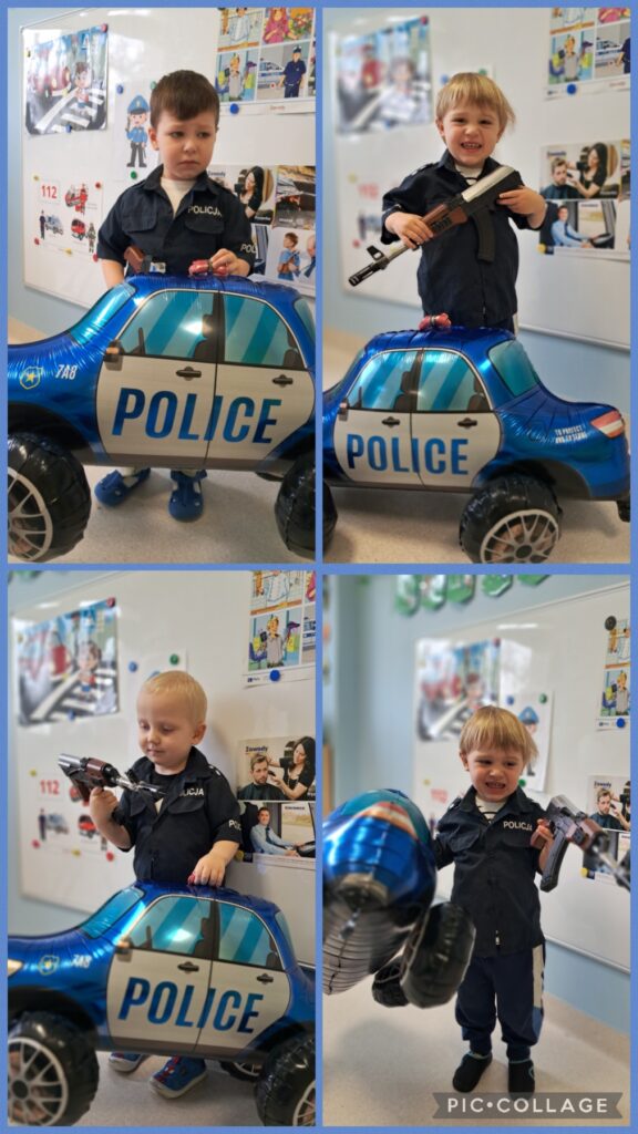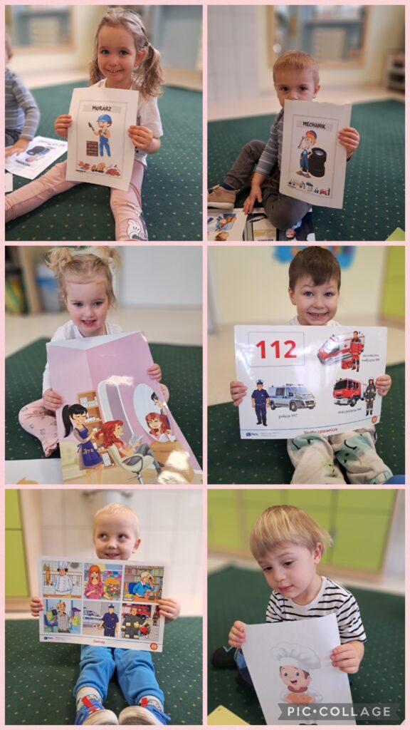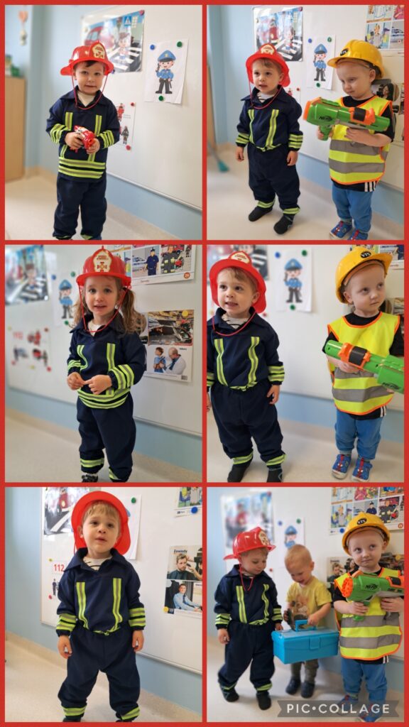 Wcielaliśmy się w lekarza, stomatologa, fryzjera, strażaka, inżyniera, sprzedawcę, policjanta. Zabawy te dały nam mnóstwo radości i pozwoliły rozwinąć naszą wyobraźnię. Wykonaliśmy w tej tematyce prace plastyczne ćwicząc przy tym motorykę małą. Uczestniczyliśmy również w zabawach muzyczno – rytmicznych przy tematycznych piosenkach takich jak „Pan Policjant porządku pilnuje…” oraz „Strażak”. Codziennie wykonywaliśmy również proste ćwiczenia gimnastyczne oraz wyciszaliśmy się przy muzyce relaksacyjnej. Nie zabrakło spacerów i zabaw na świeżym powietrzu.